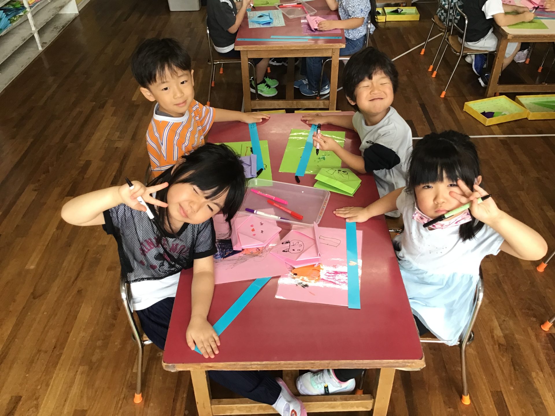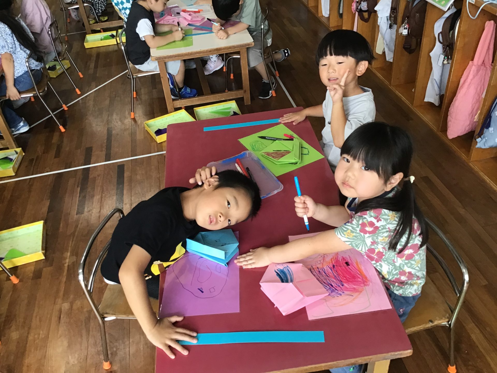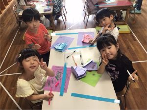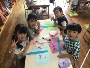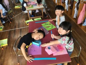 色画用紙で箱を折って、それぞれの好きな模様を描いていきます。