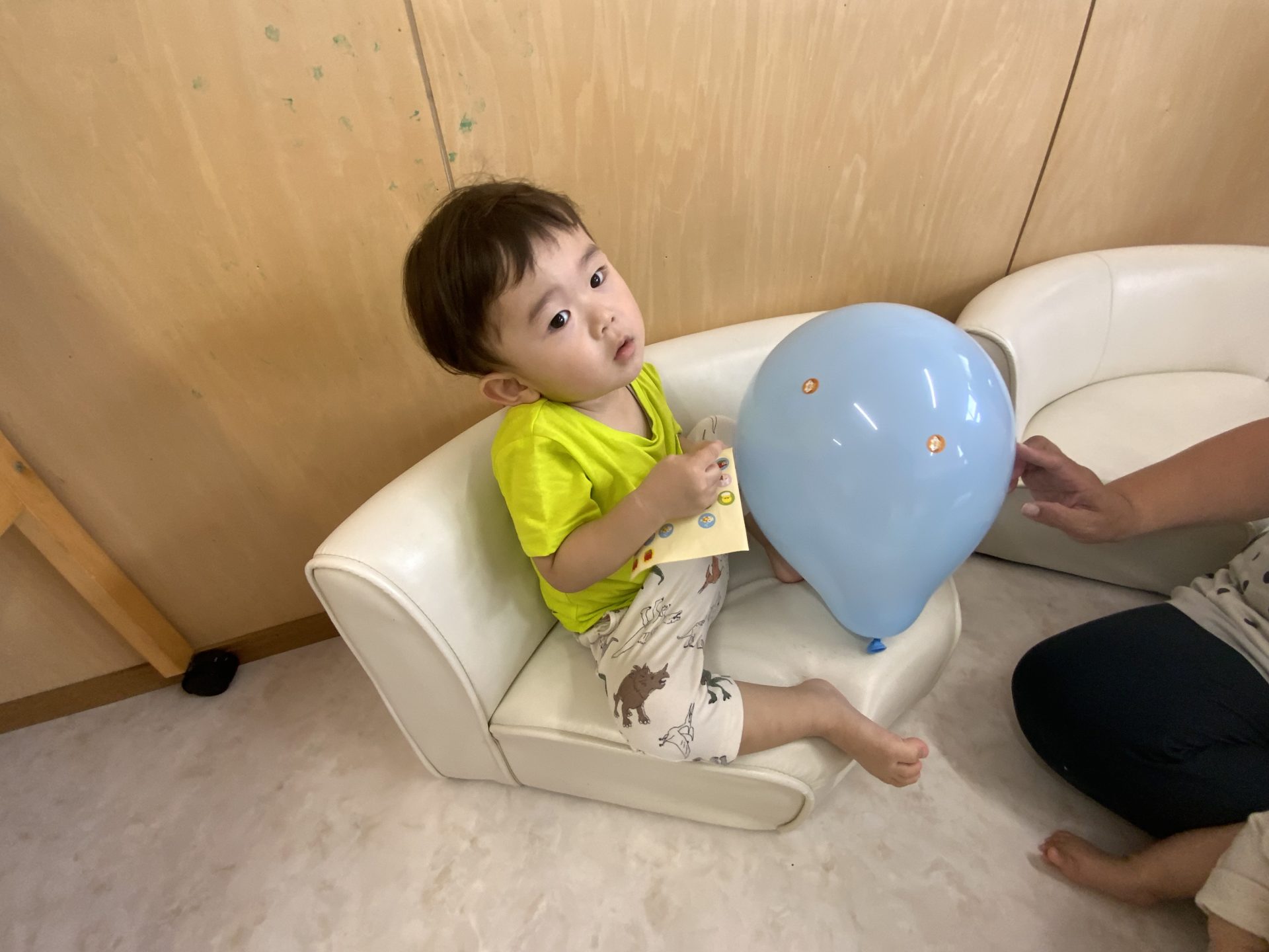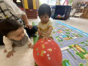 膨らませてもらった風船を受け取るとニコニコしながら遊んでいて、ポンポンと飛ばしてみたり投げた風船を追い掛けてみたりして楽しんでいましたよ♩