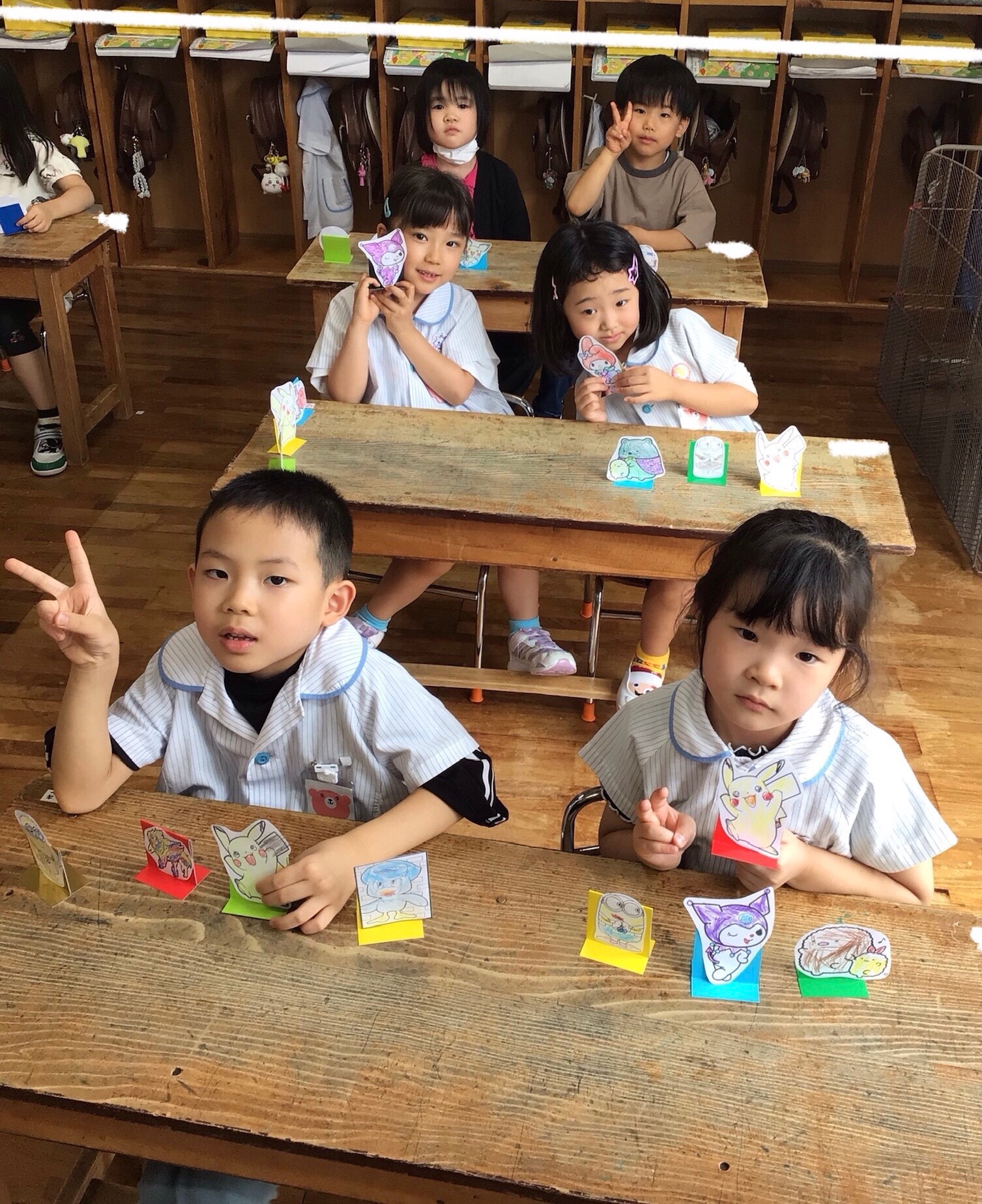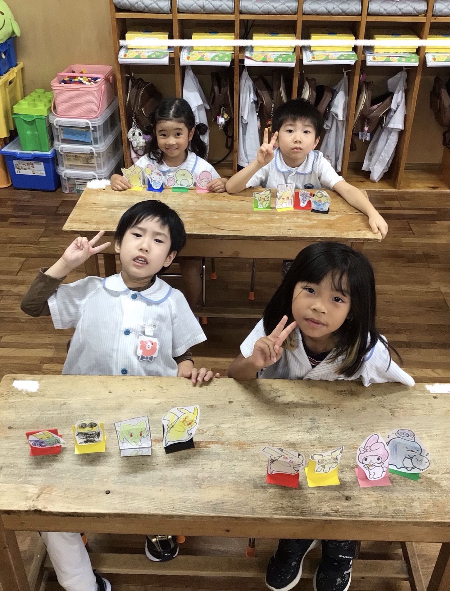 今日は様々なキャラクターのイラストにクーピーを使って色塗りをして、それを土台に貼り付けていきました。