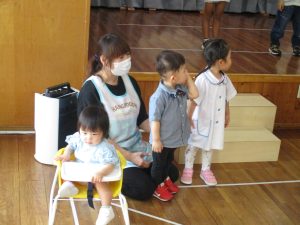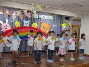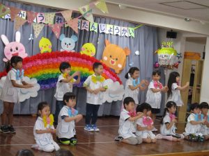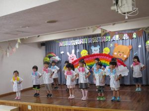 まずは大きな声で朝の歌を歌って、年長組さんの始めの言葉でお誕生会スタート!