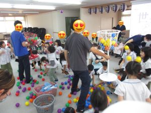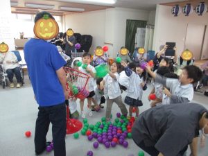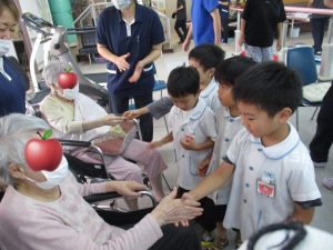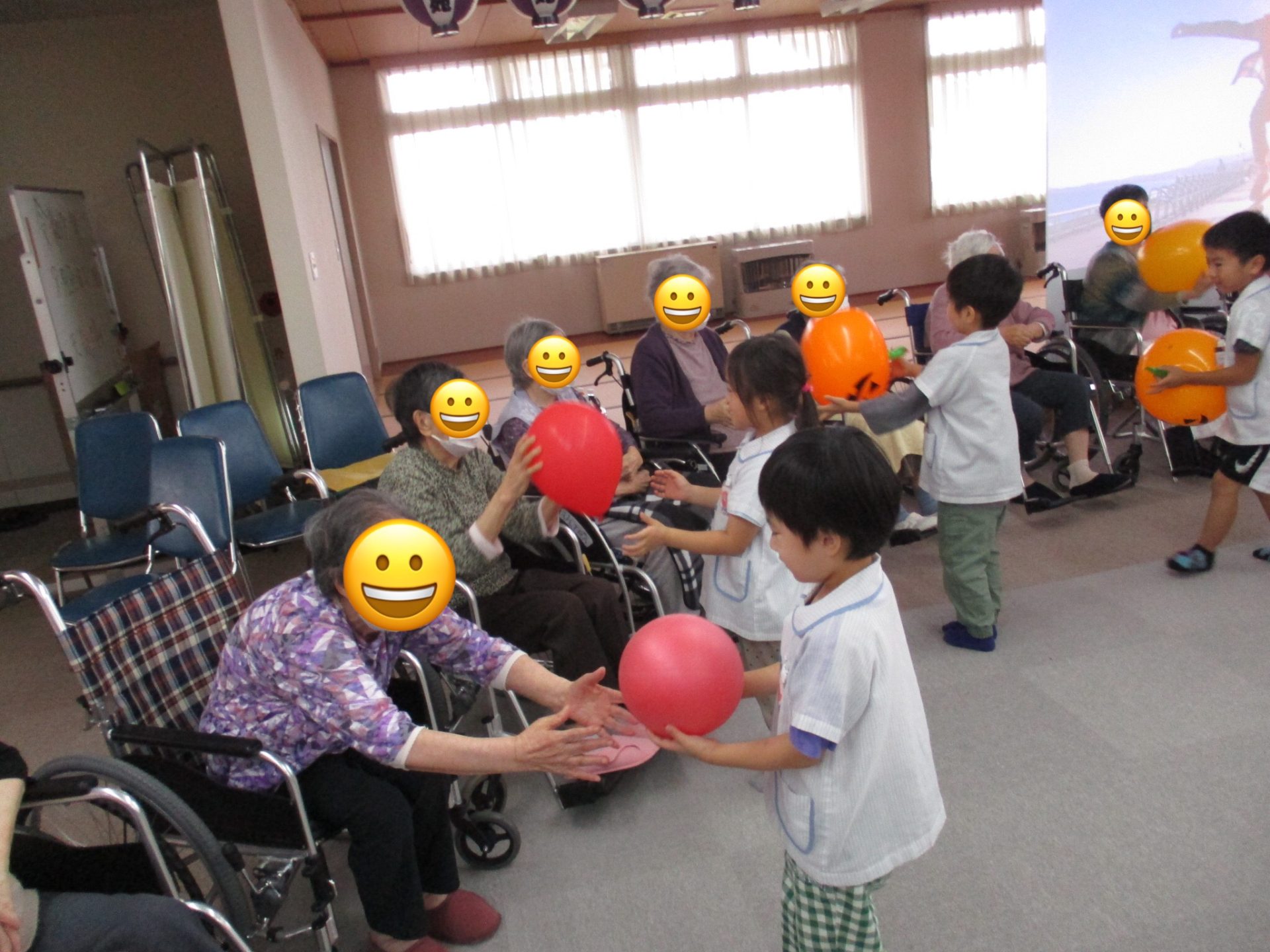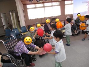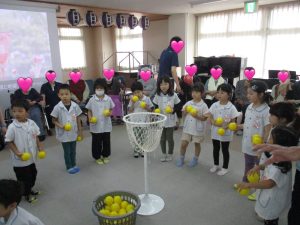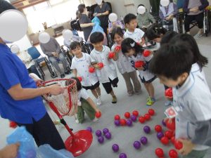 施設の方が玉入れ用具を貸し出してくれたので、おじいちゃん・おばあちゃんの前で玉入れ競争を披露すると「頑張れ〜!」と応援してもらいながら、楽しく玉入れを行なう姿が見られていましたよ♩
