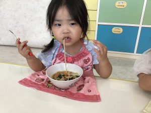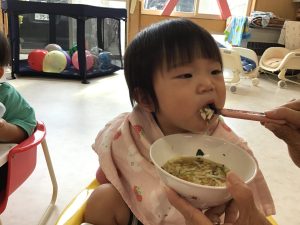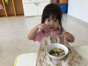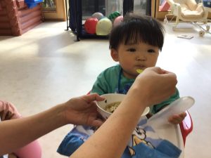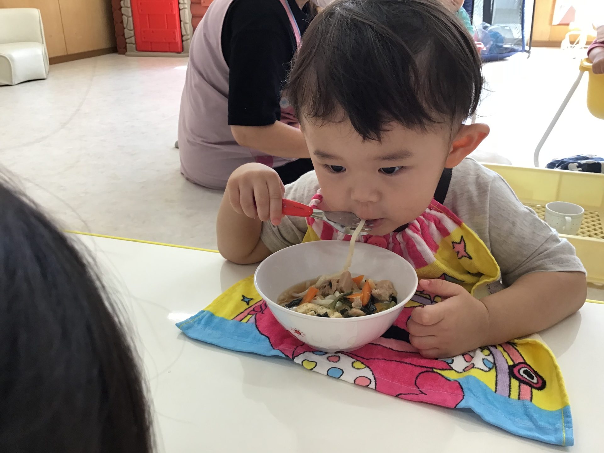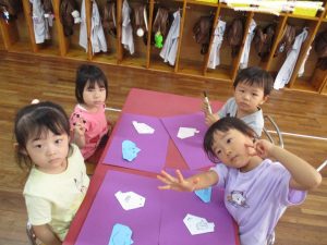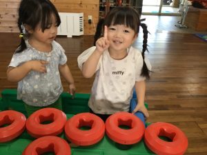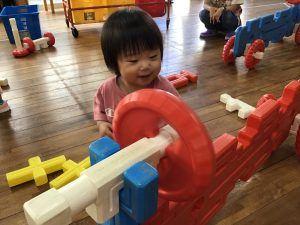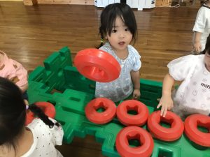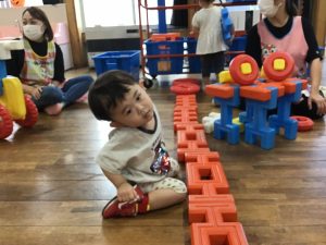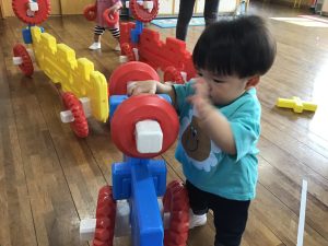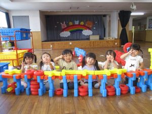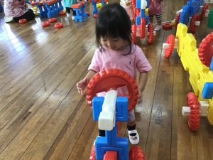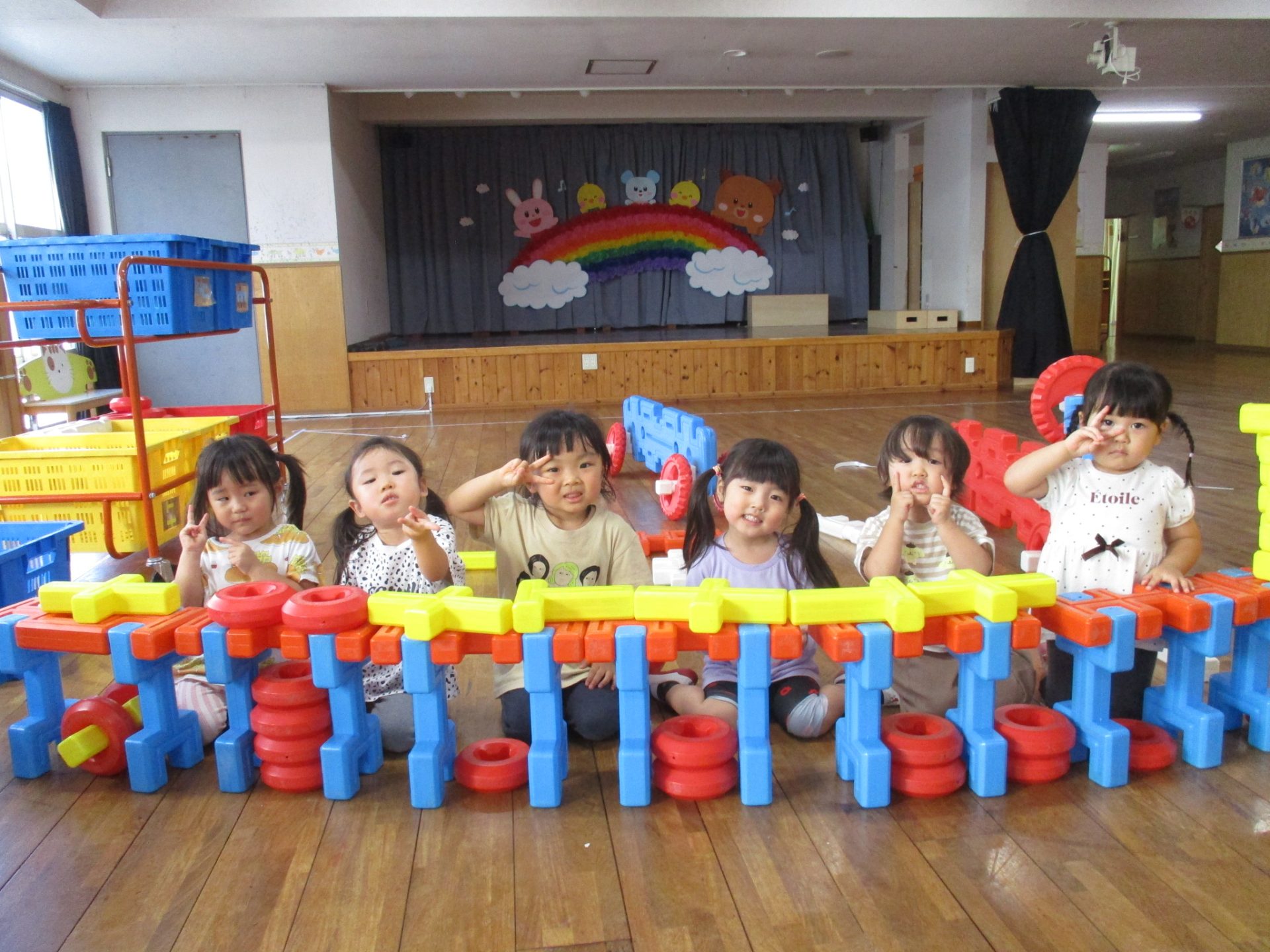 ホールで遊んでいた2クラスは大型遊具で一緒に遊んでいたり、つぼみ組さんがお姉さん気分で、ふたば組さんの手を取ってホールをお散歩したり、遊んでいた遊具を貸してあげたりしながら仲良く遊ぶ姿が見られていました!