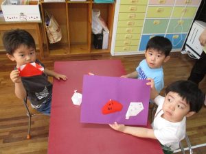 「僕のオバケはこわい顔にしたよ」「こわいの嫌だから可愛い顔にした!」と自分の作品を嬉しそうに披露してくれましたよ♩