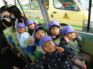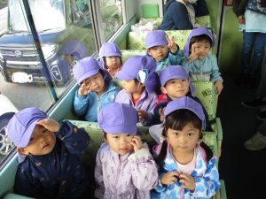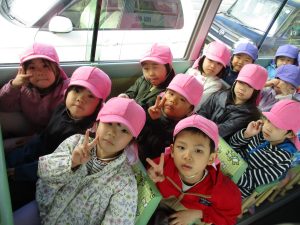「早くやりたいな〜!」とバスの中で待っていた子どもたち。