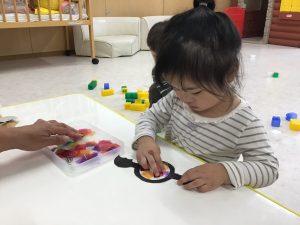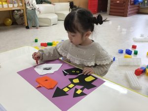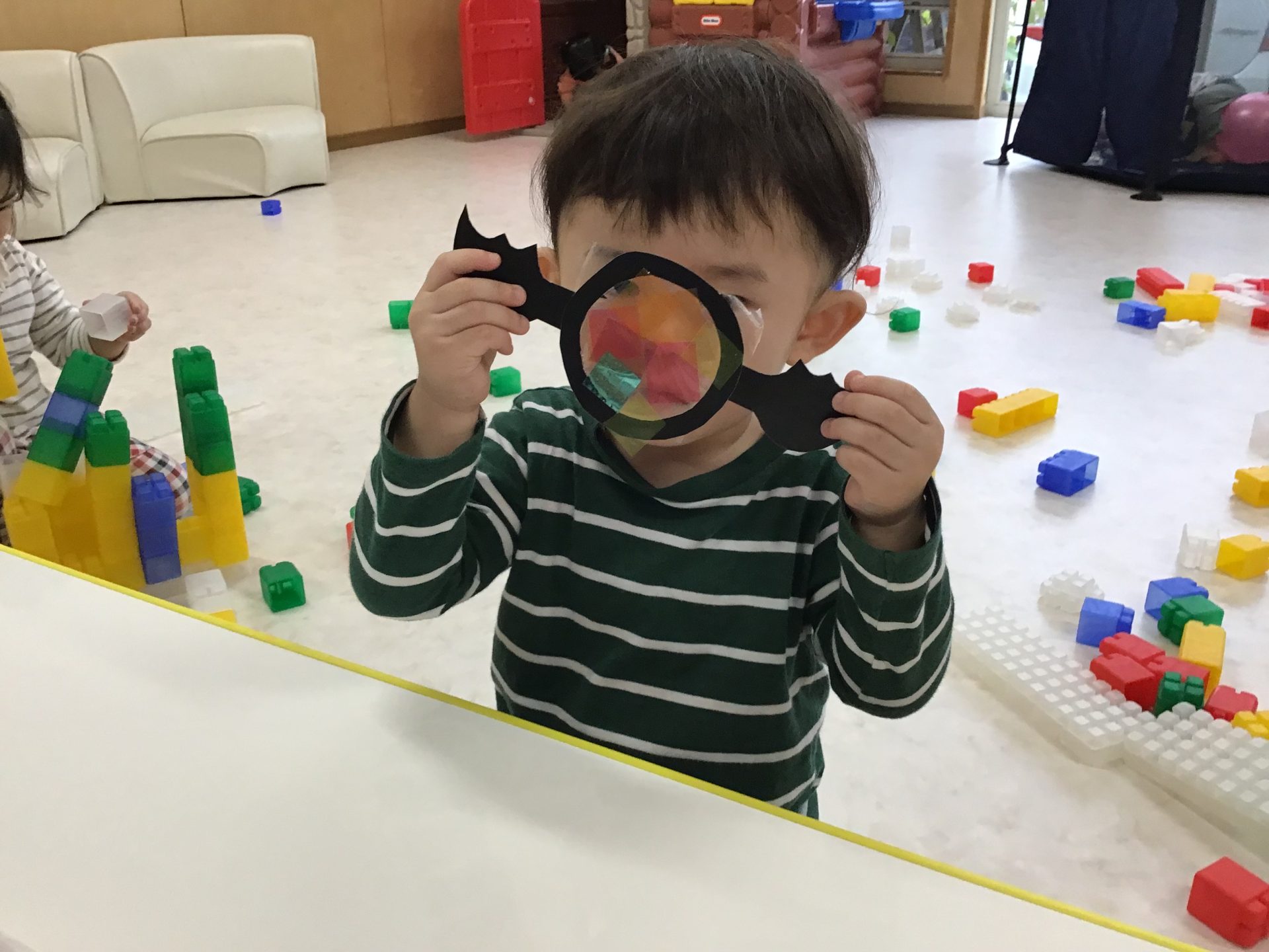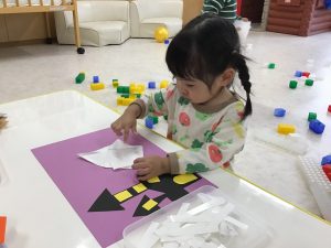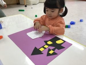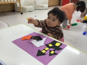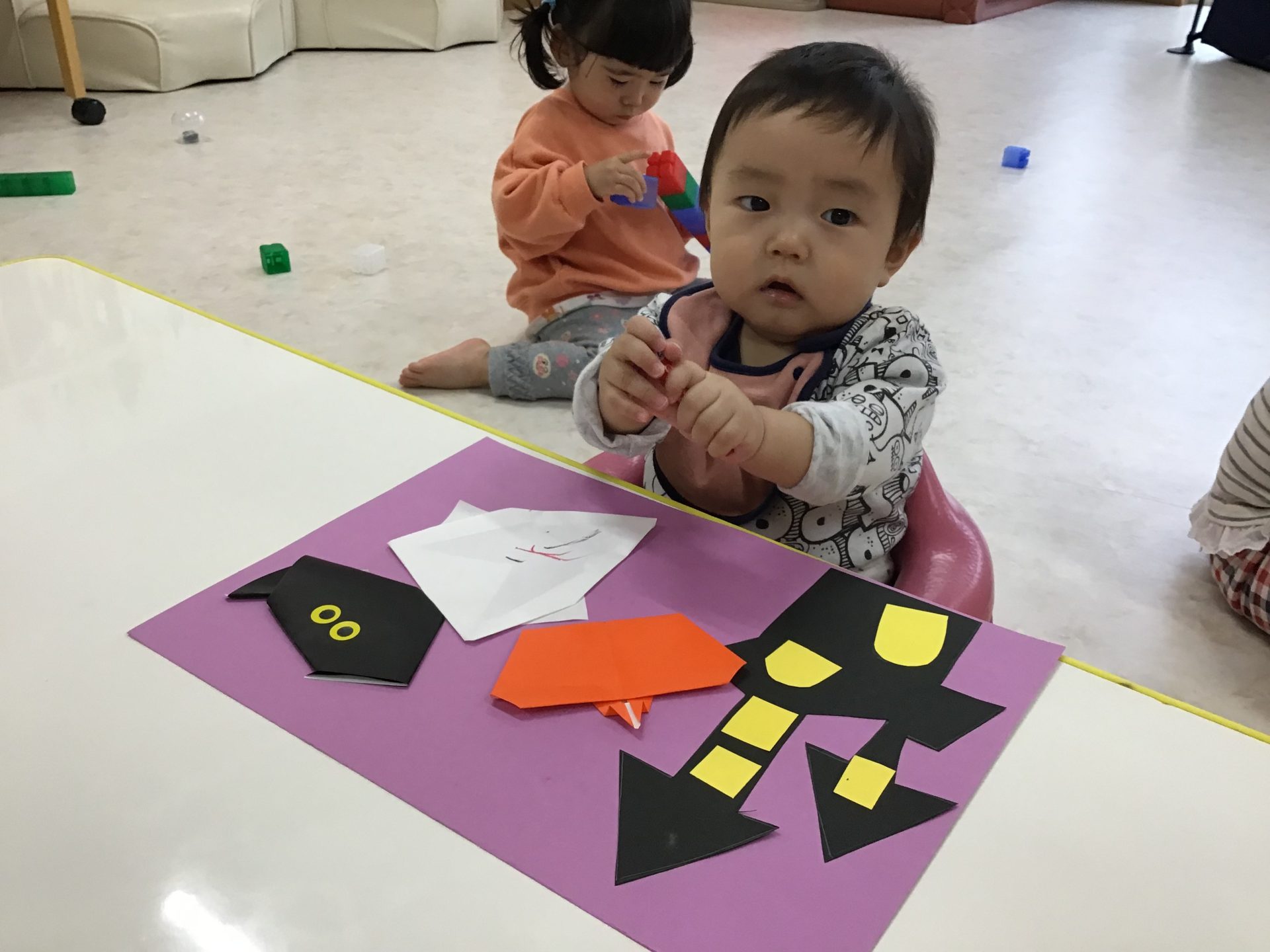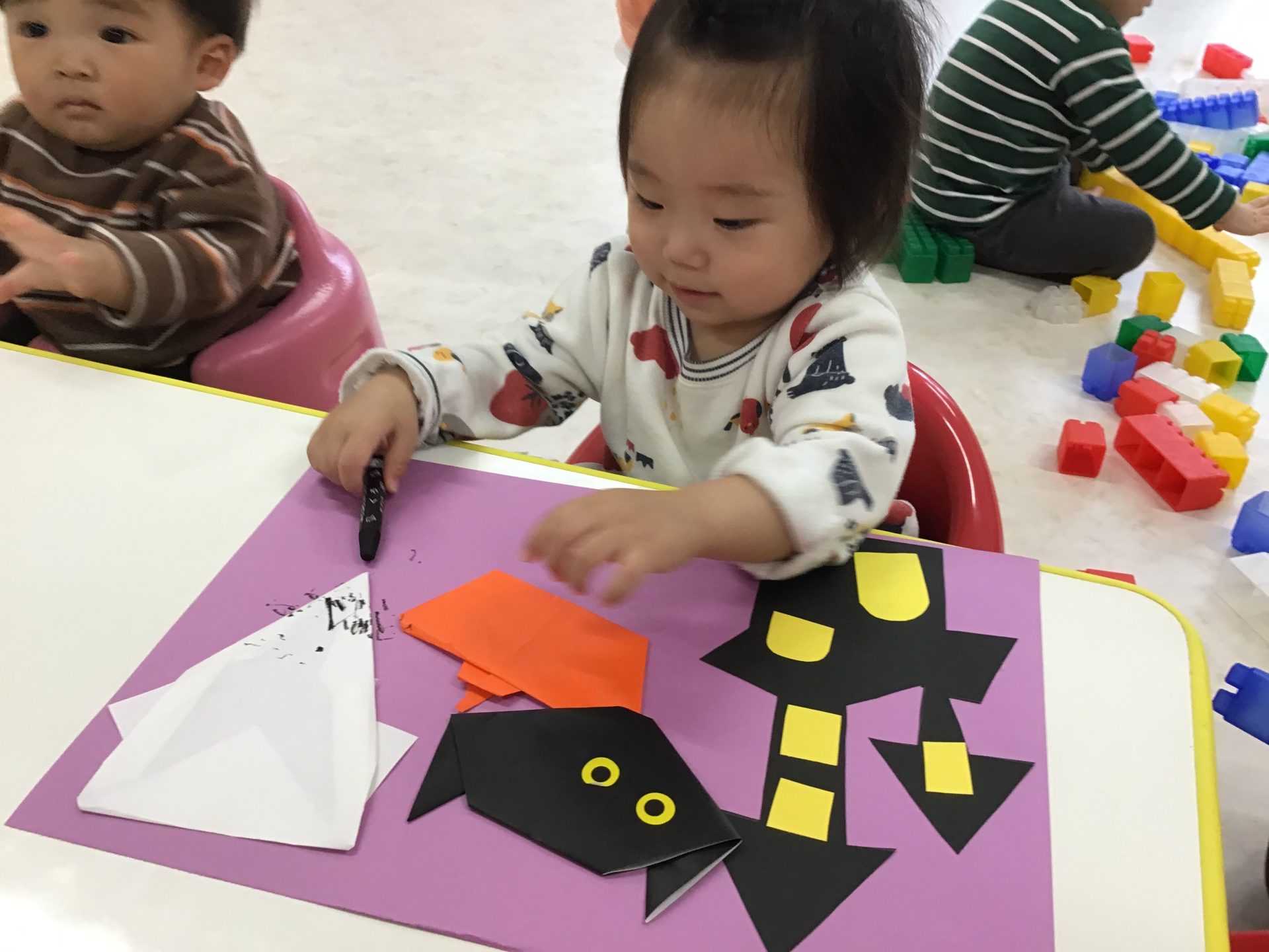 オバケやカボチャの形に折っておいた折り紙を色画用紙に貼ったり、透明カラーセロハンを粘着テープに貼っていったり、様々な活動を楽しんでいましたよ♩