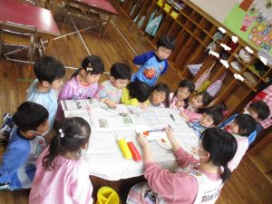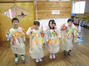 今回は『ミノムシ』をテーマにしたゲームで、カラーポリ袋を洋服の様にした物を着た子がホールを早歩きしながら歩き回り、他の子どもたちが細長く切っておいた色画用紙を持ちながら追い掛けていきます!