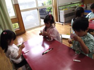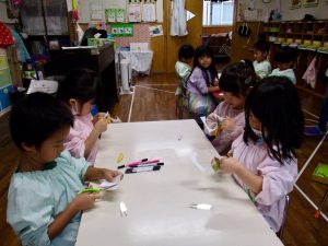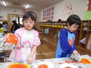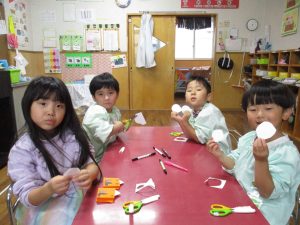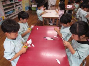 オレンジ色の折り紙をもらって、先生の作り方説明しっかり聞きながら作っている姿が見られていましたよ♩