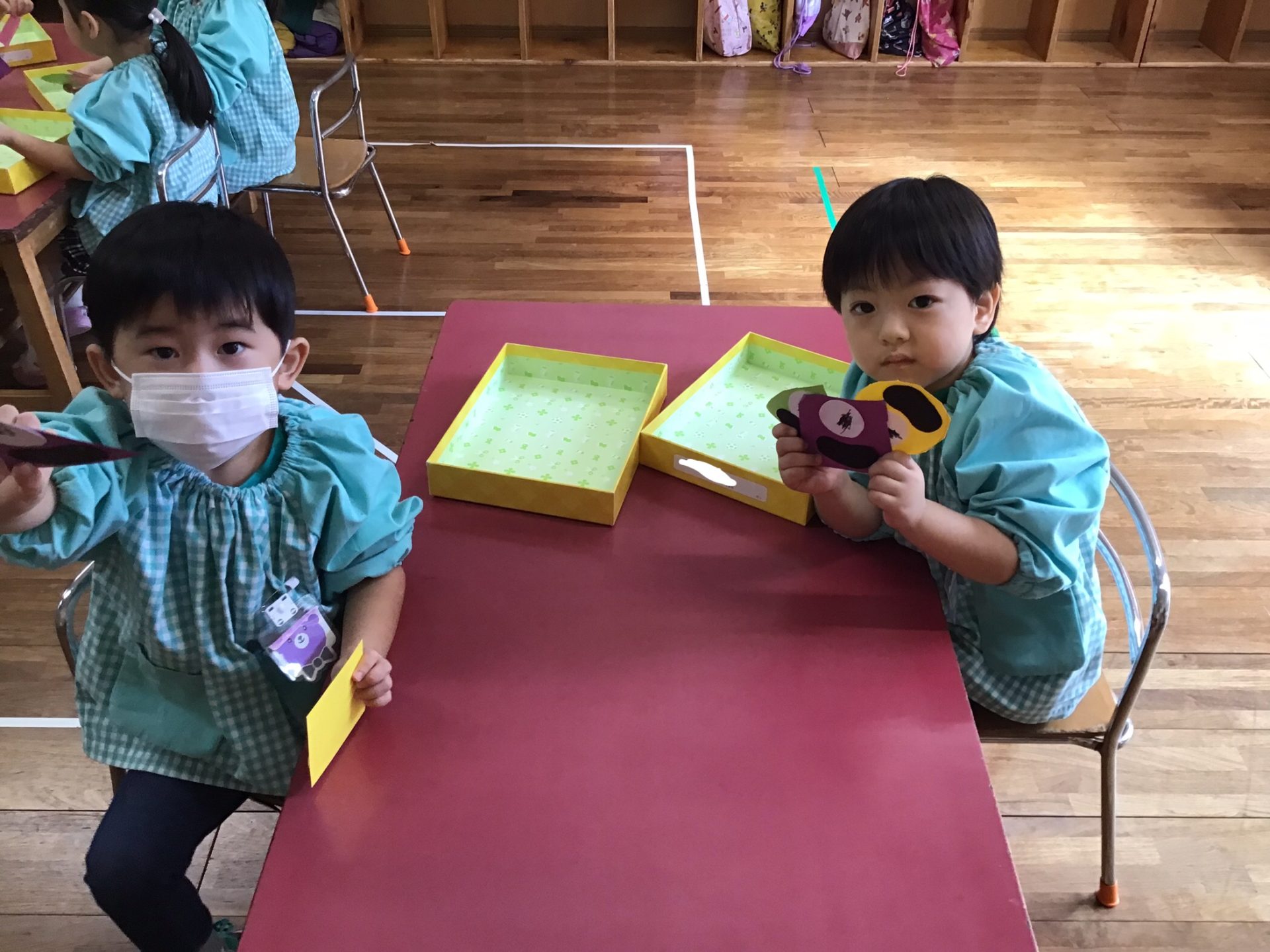 今日は昨日、形探しをして見つけた三角や四角・丸の形の画用紙に目玉や表情をつけてモンスターを作っていきました。