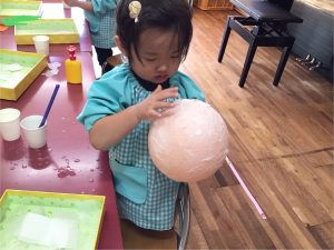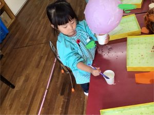 今日は膨らませた風船に、お花紙を水で溶いたボンドに浸しながら貼り付けていきました。