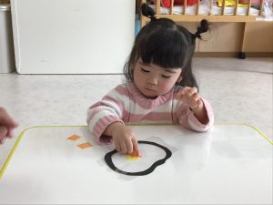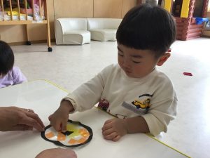 キャンディーやコウモリ等の様々なモチーフが準備されていて、最後まで飽きる事なく取り組む事が出来ていましたよ♩