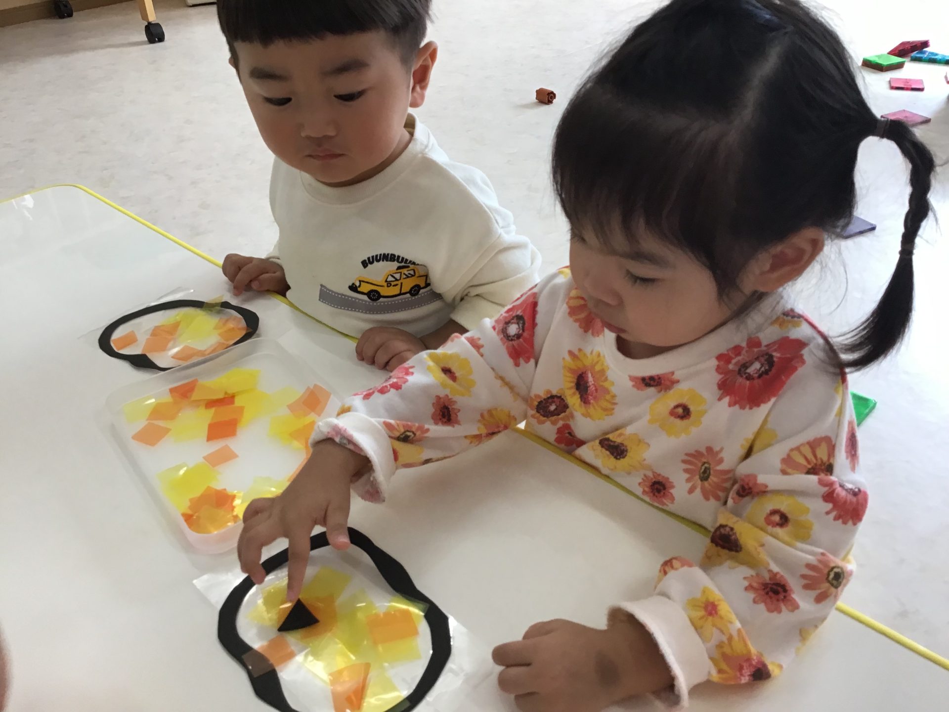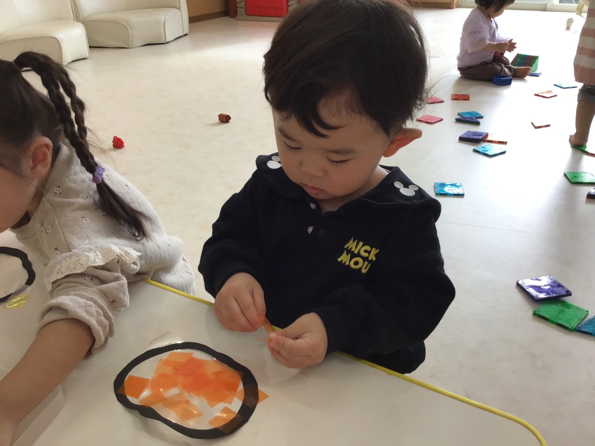 キャンディーやコウモリ等の様々なモチーフが準備されていて、最後まで飽きる事なく取り組む事が出来ていましたよ♩