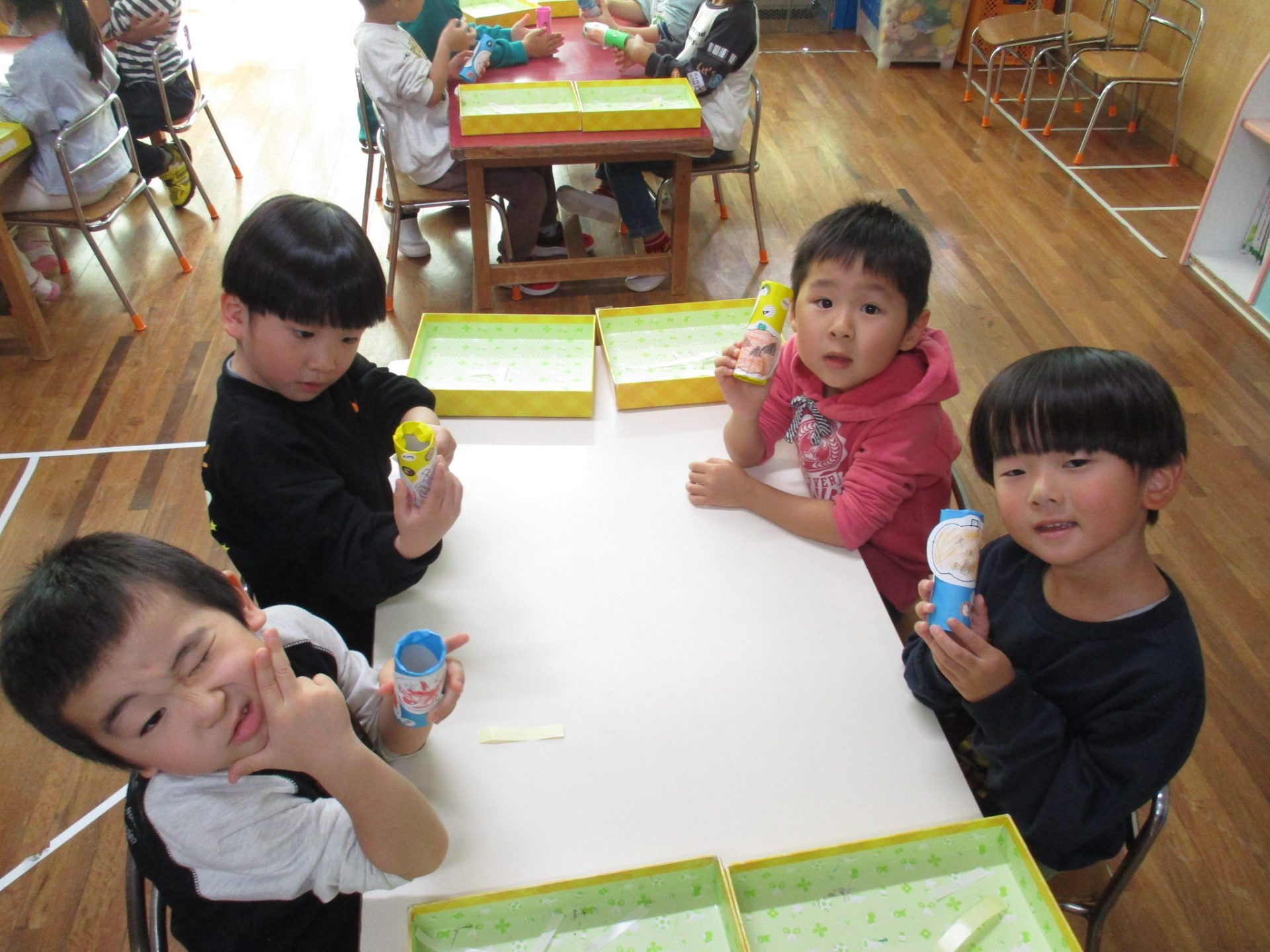 今日はトイレットペーパー芯に折り紙を巻き付けて、そこにハロウィンイラストを貼り付けていきました!