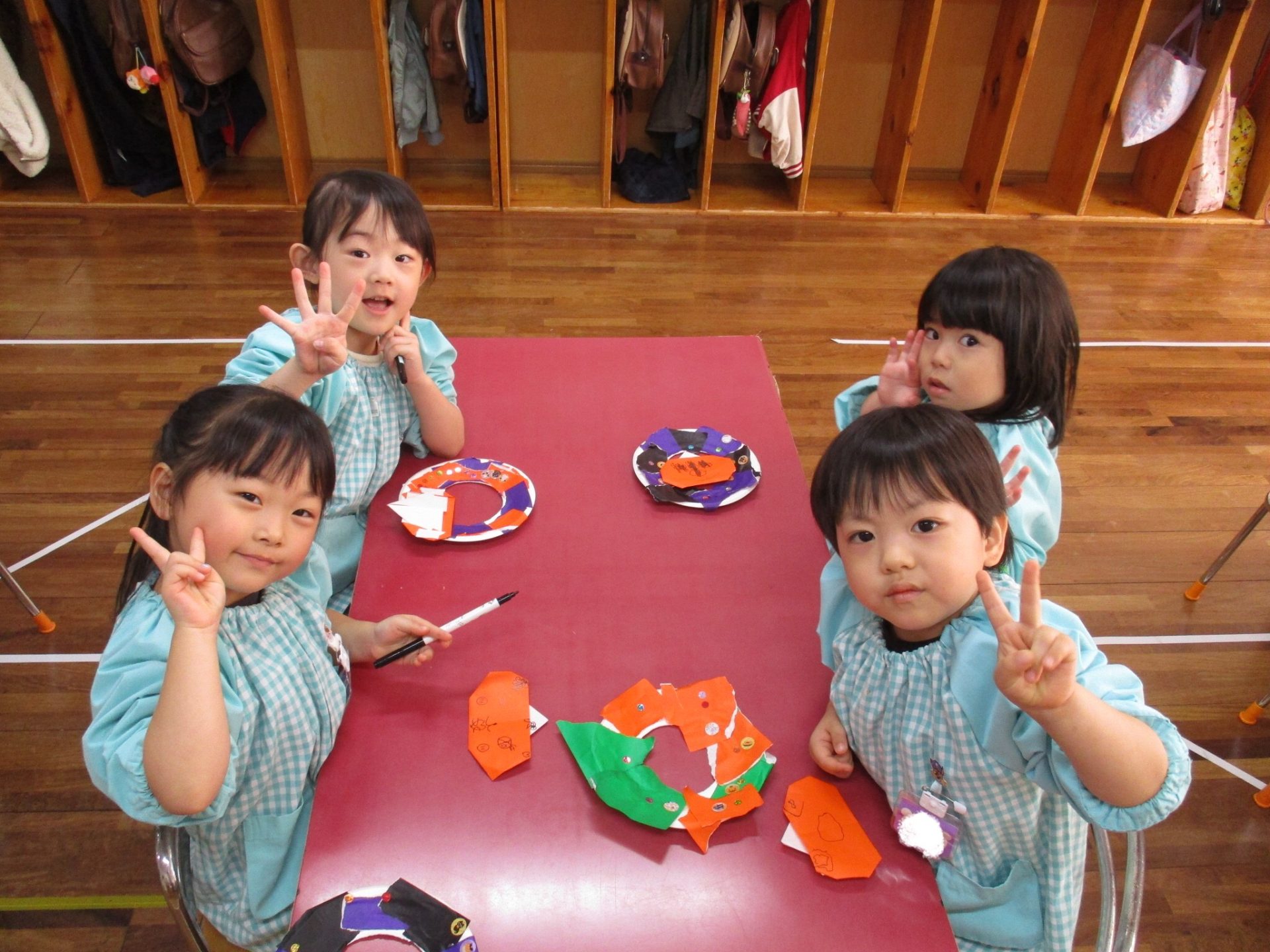 今日は昨日折り紙を貼り付けた紙皿に折り紙で折ったカボチャを貼っていきました。