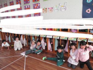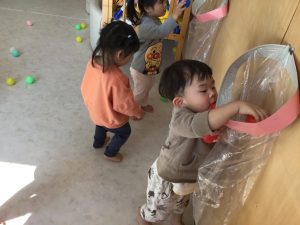 フラフープを跨いだり、壁に袋を設置してゴールの様にしていった所にミニボールを入れていったりして楽しんでいましたよ♩