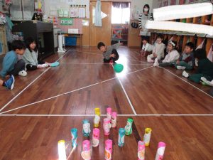 今日は昨日作ったトイレットペーパー芯を使ってボーリングゲームを楽しんでいました。