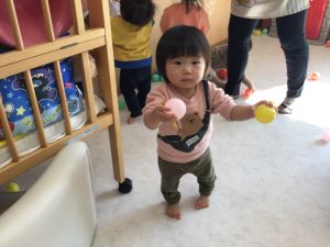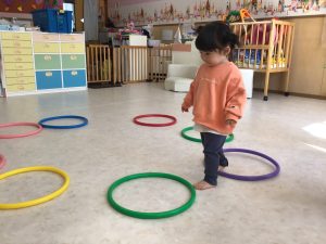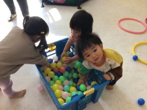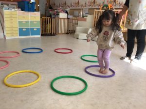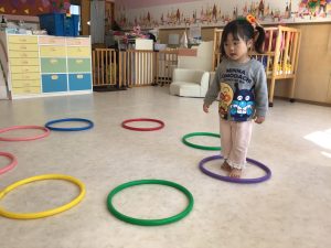今日はお部屋でミニボールとフラフープを使って遊んでいました。