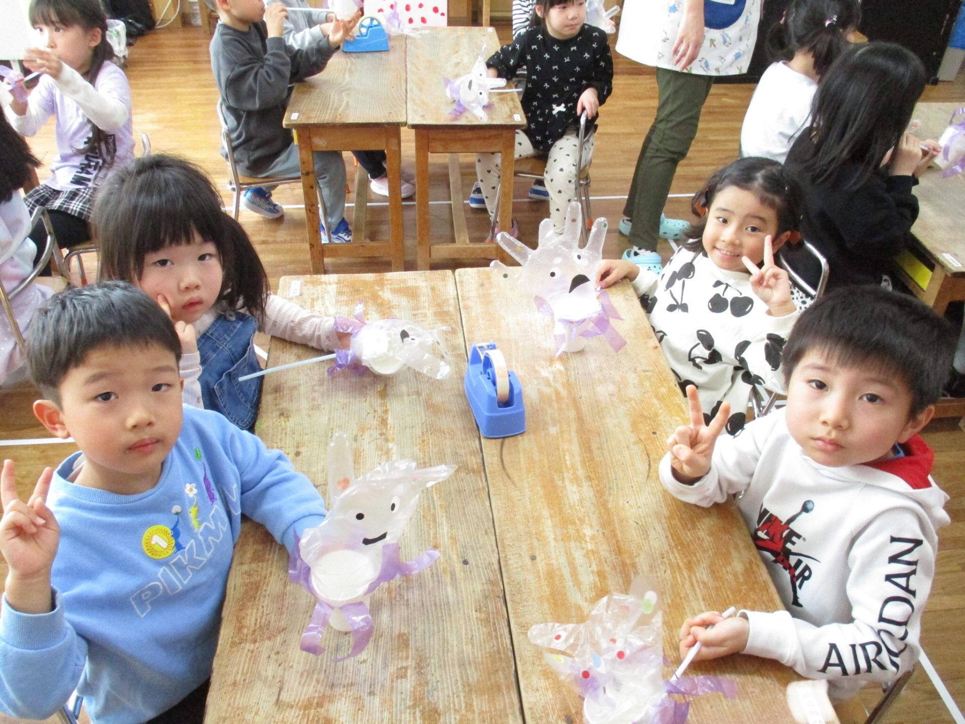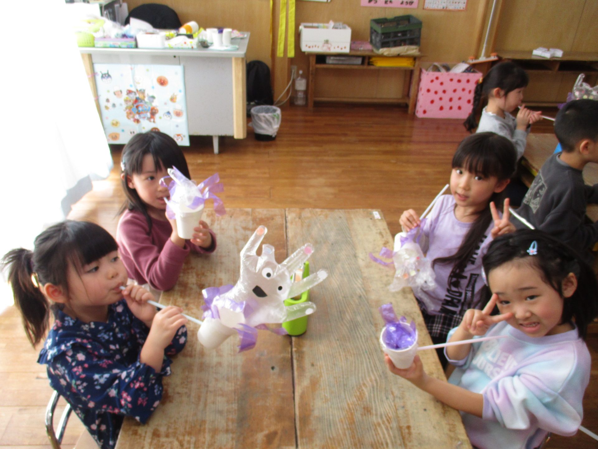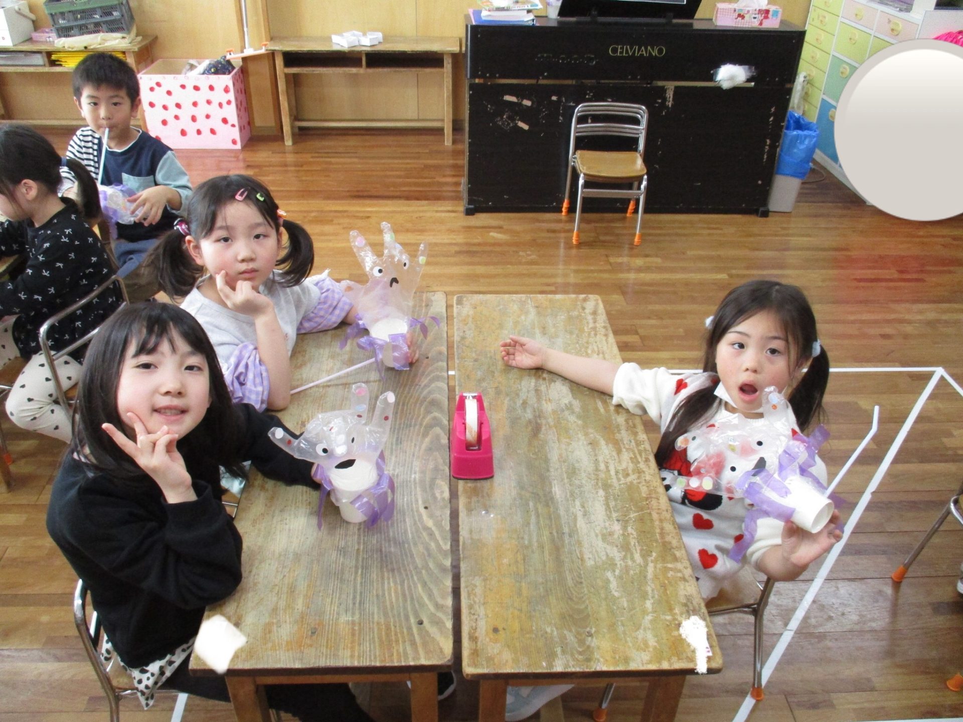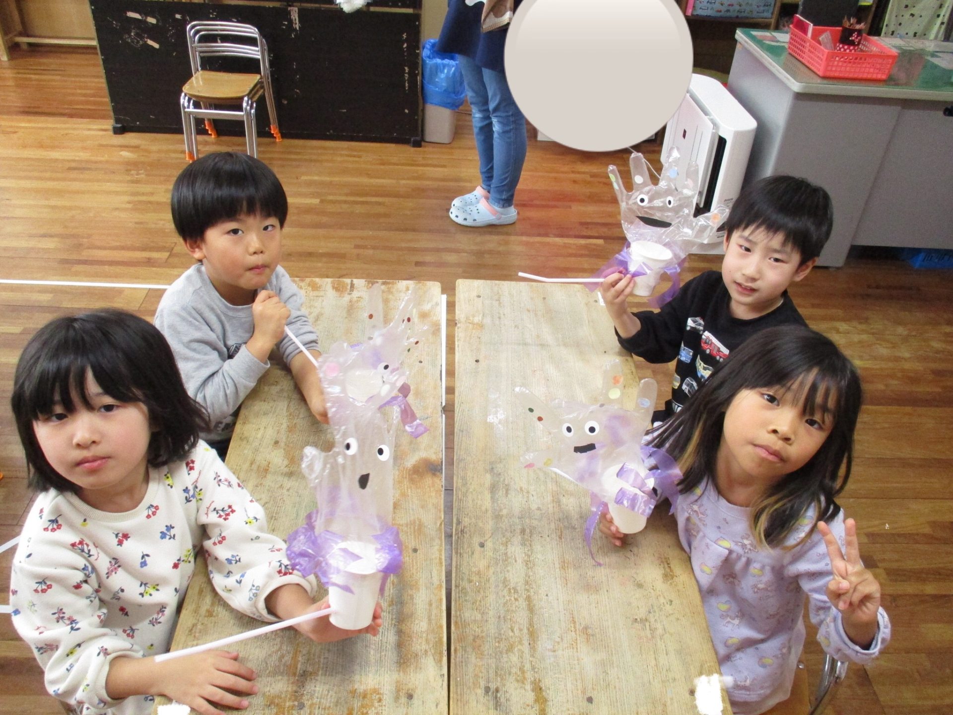 今日は紙コップと透明ポリ手袋を使ってオバケのおもちゃを作っていました。