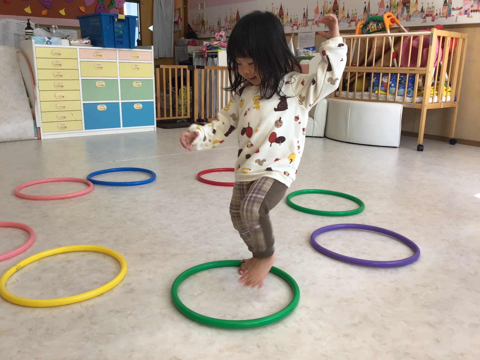 今日はお部屋でミニボールとフラフープを使って遊んでいました。