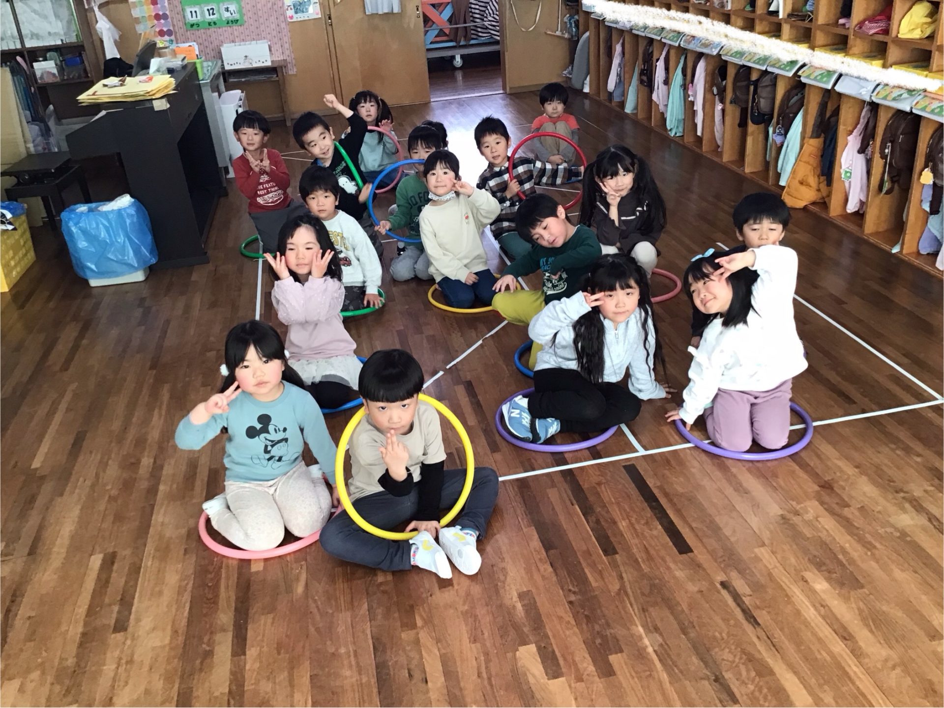 きくさんでは、お部屋でもフラフープを使った運動遊びをしていました!