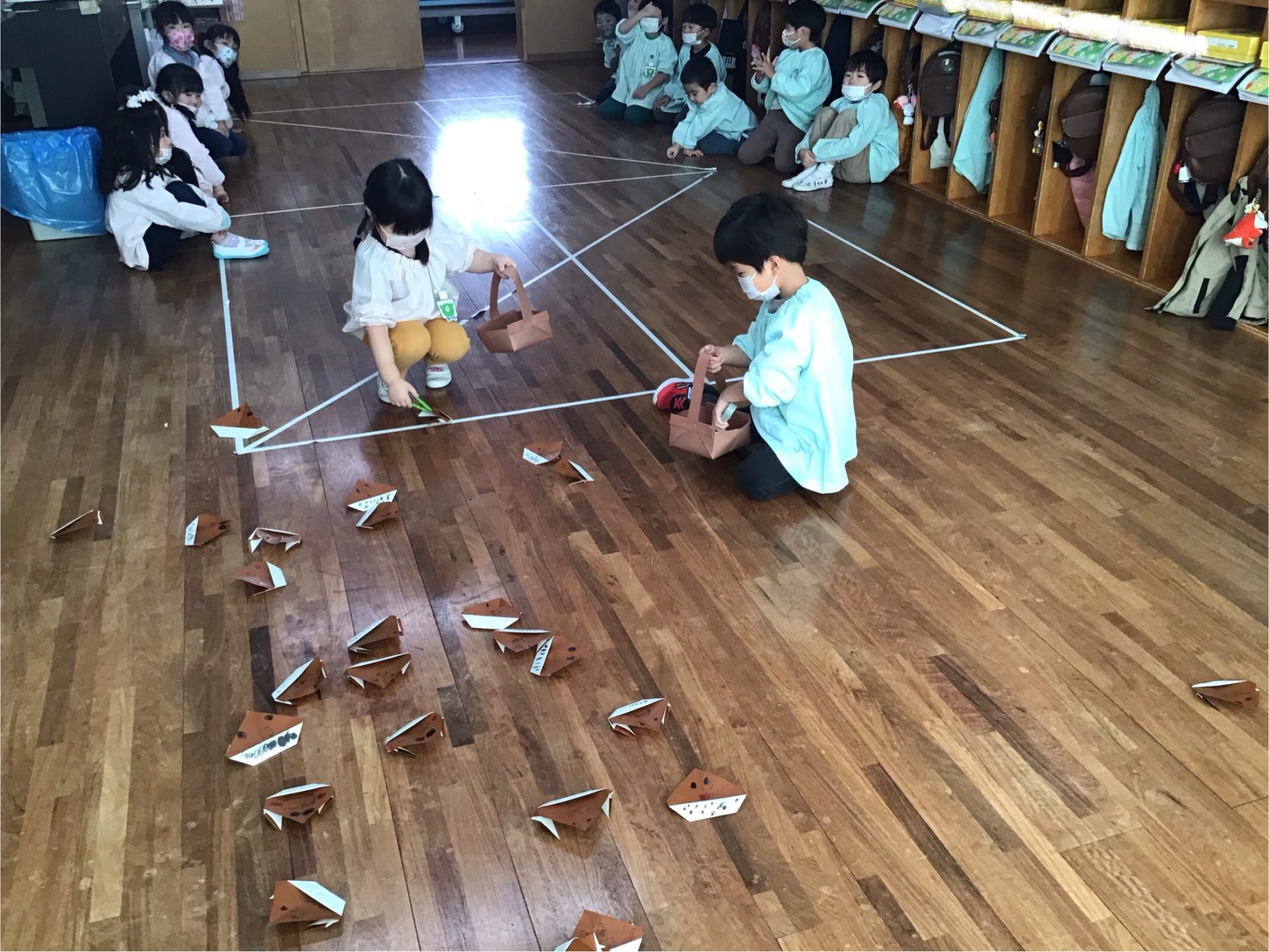 今日は折り紙で作った栗をお部屋中に置いておき、トングを使って拾い集める『栗拾いゲーム』を楽しんでいました!