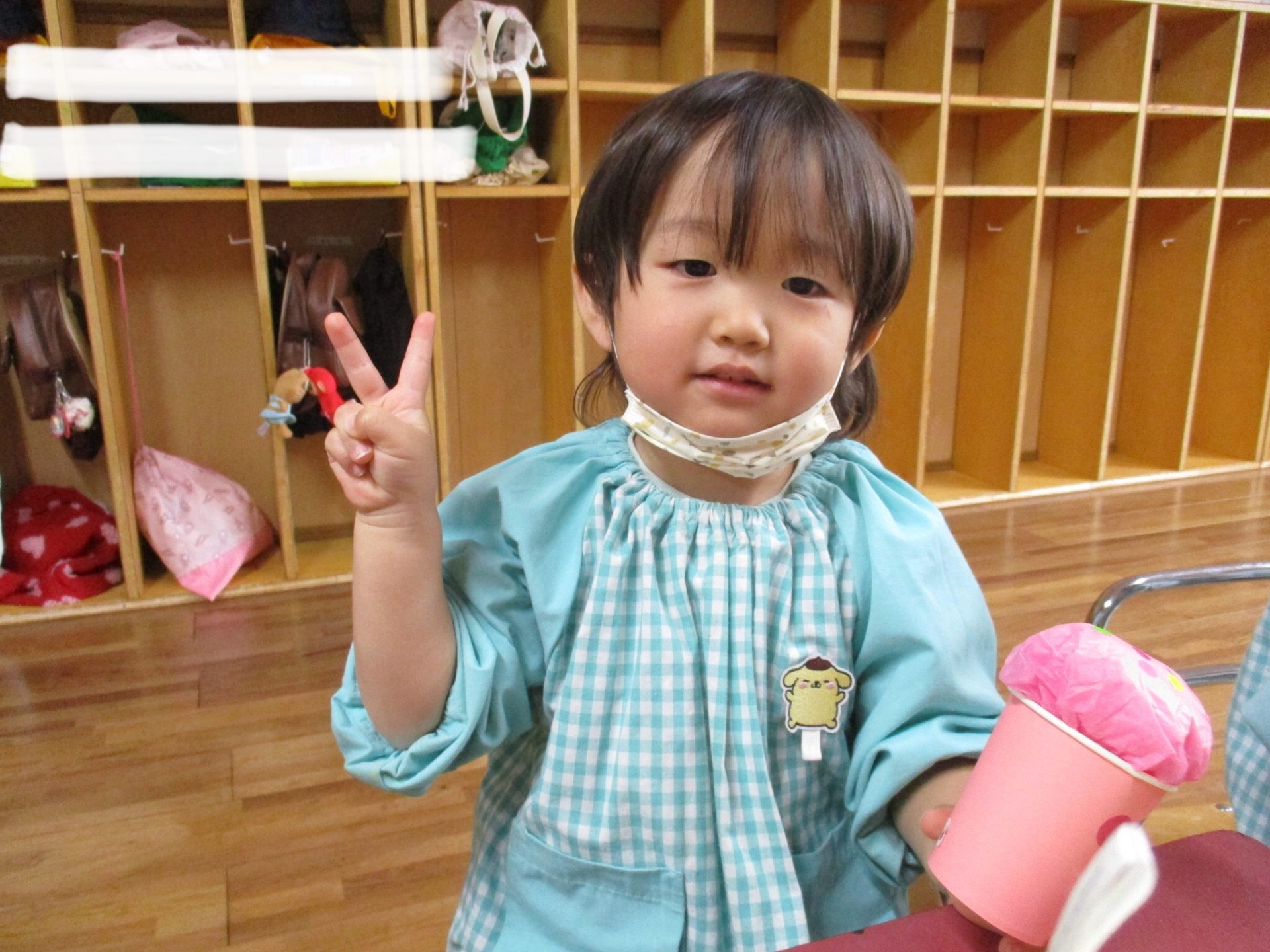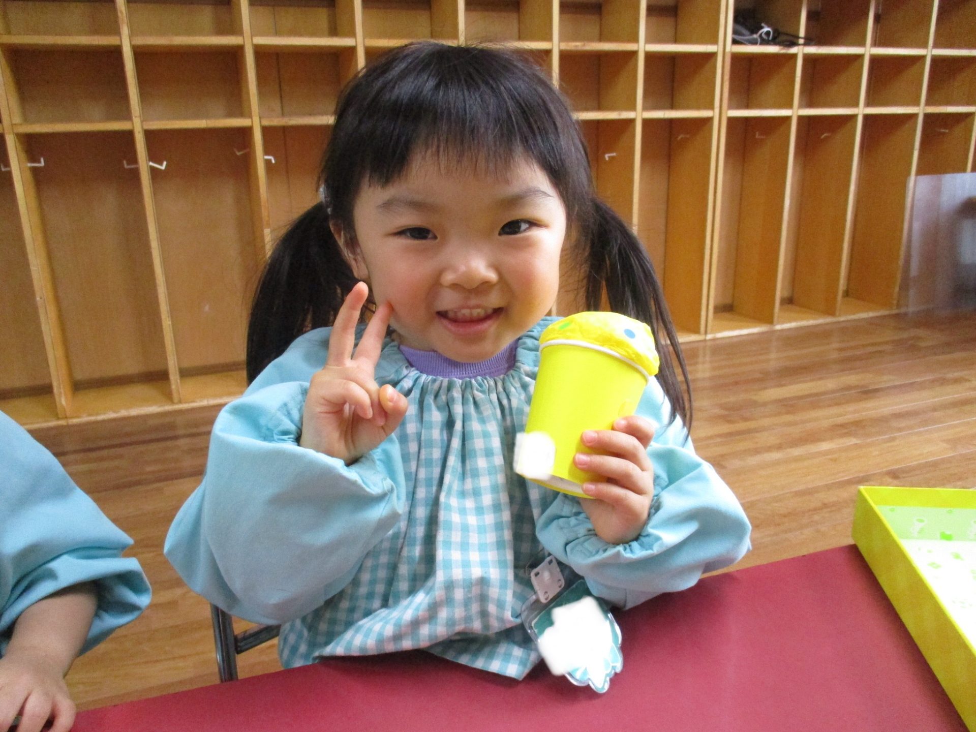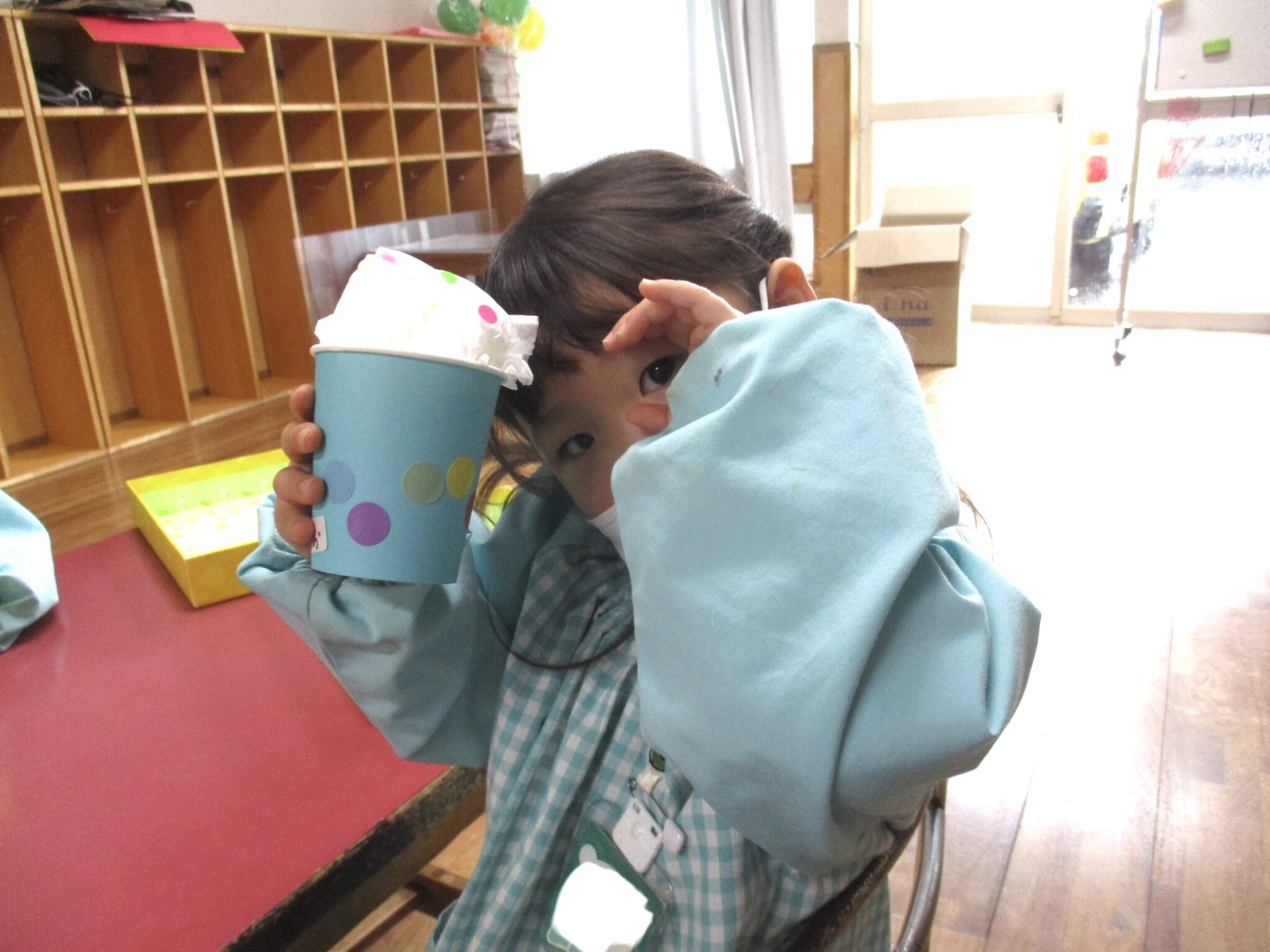 今日は紙コップやお花紙を使って『カップケーキ』を作っていきましたよ!