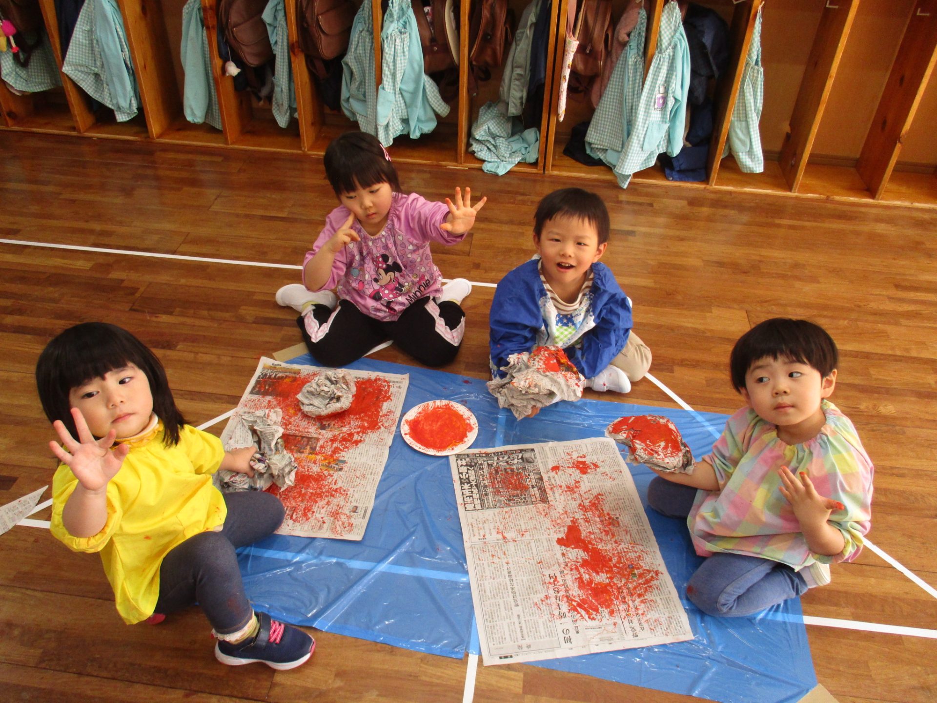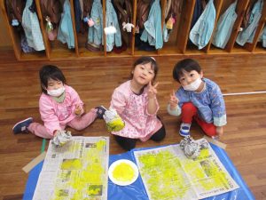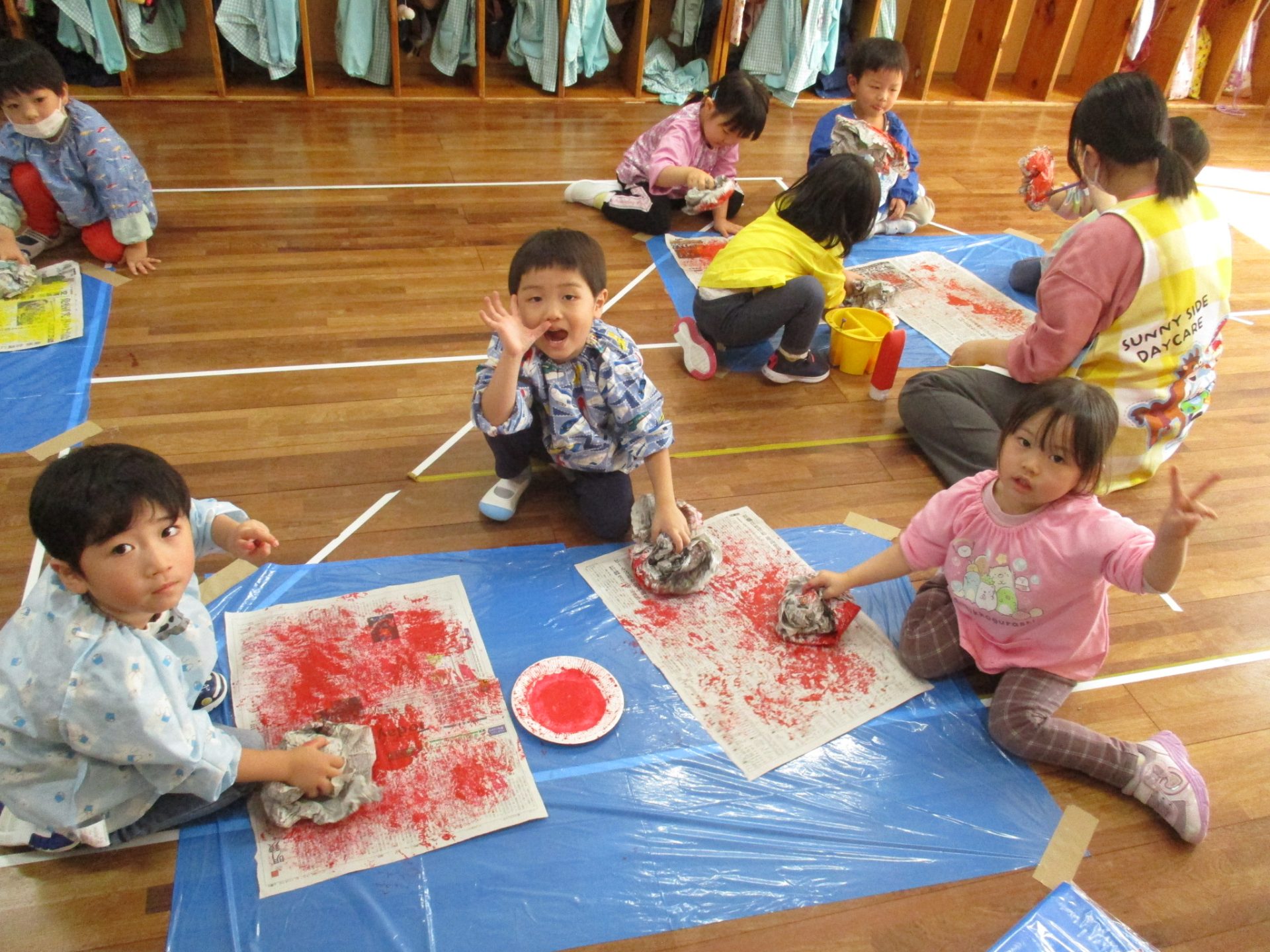 みんなで協力をし合いながら、新聞紙がキレイに色付く様に・・・と頑張っていましたよ♩