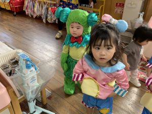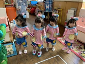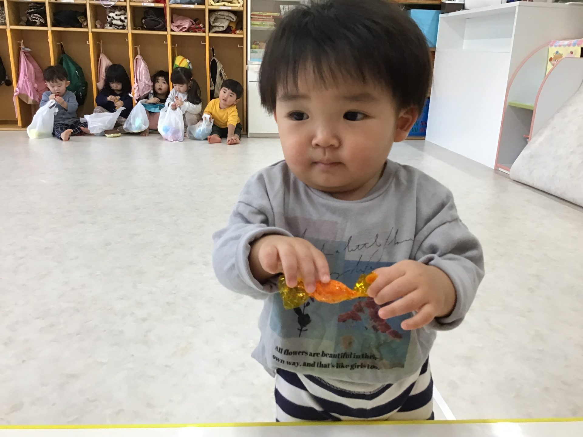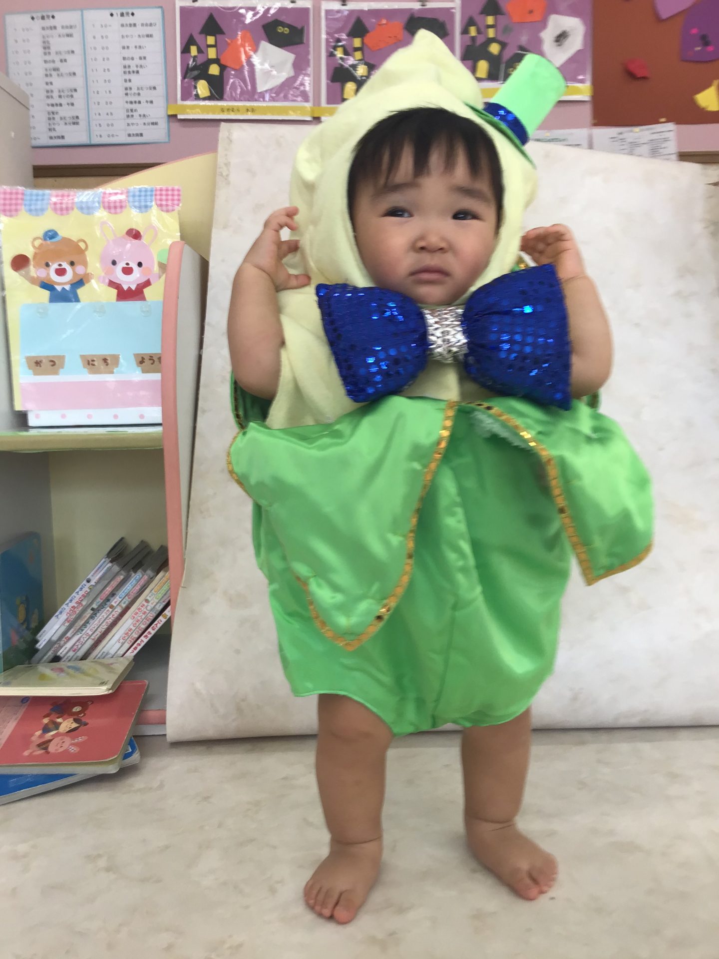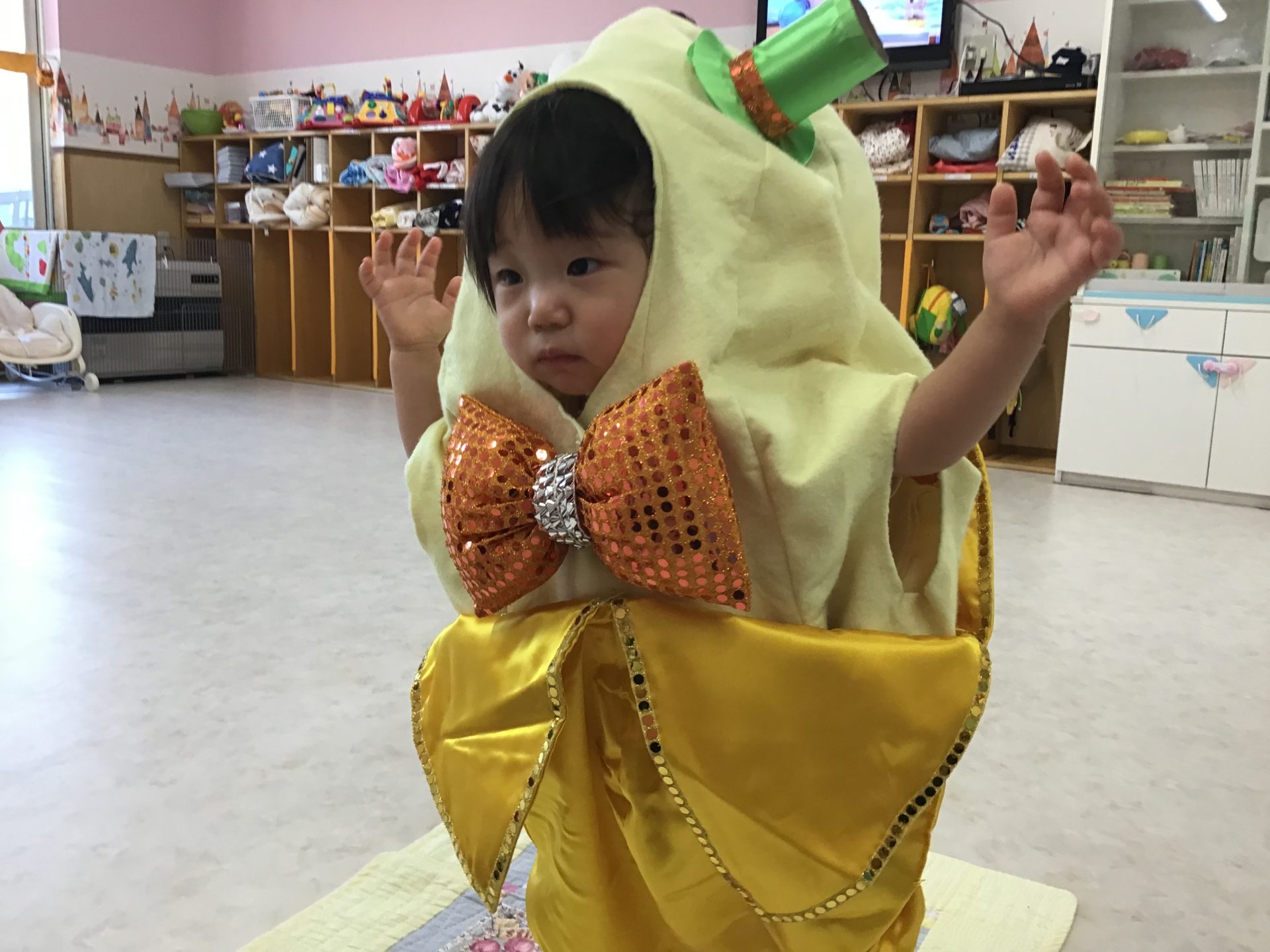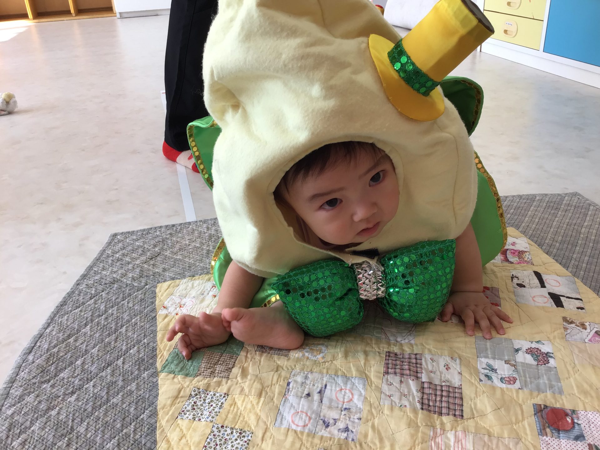 0歳児さんは初めてのお遊戯会の参加でした。踊った曲は「バナナダンス」🍌「おひざ」だよと言うとおひざを曲げてくれたり、バイバイもしてくれました。バナナを着る時、初めは大号泣でしたが、慣れてくると着ながらも練習をしてくれました。