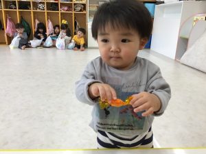 1歳児さんは「まいにちあははをみぃつけた」皆さんも知っているコッシーやすいちゃんが踊っている曲です。「おいーっす」「ピース」と楽しく踊ってくれました。✌️😄