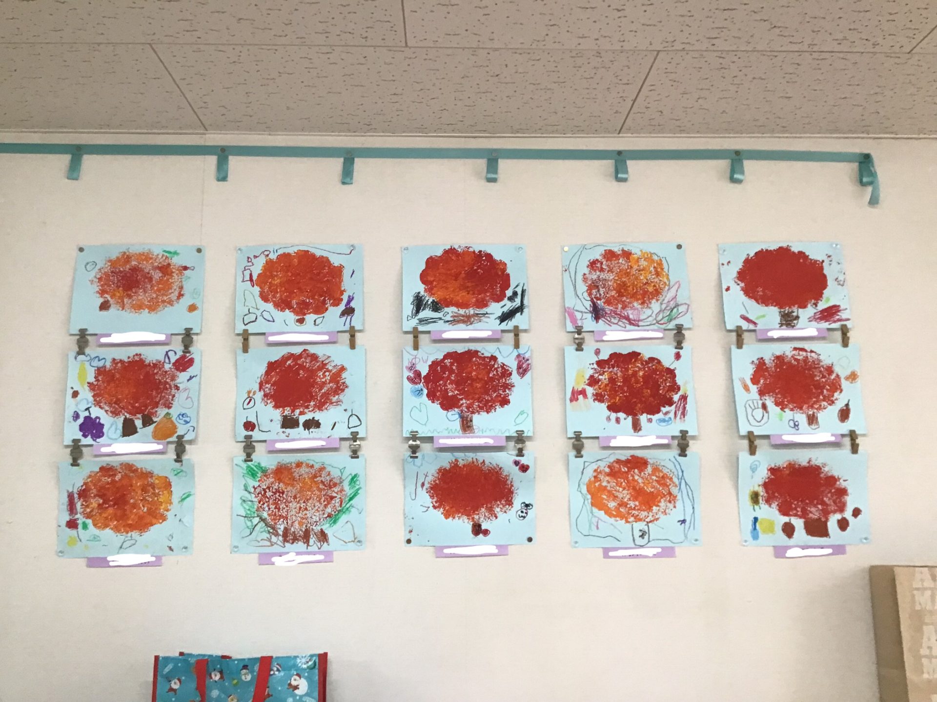 絵の具を乾かし、クレヨンで木の幹や周りに秋にまつわるお絵描きをして完成‼️