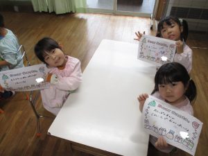 クリスマスのイラストが描かれた紙に、自分の欲しいプレゼントを文字で書いていったのですが、自分の名前を書く事にも挑戦して頑張っていましたよ!