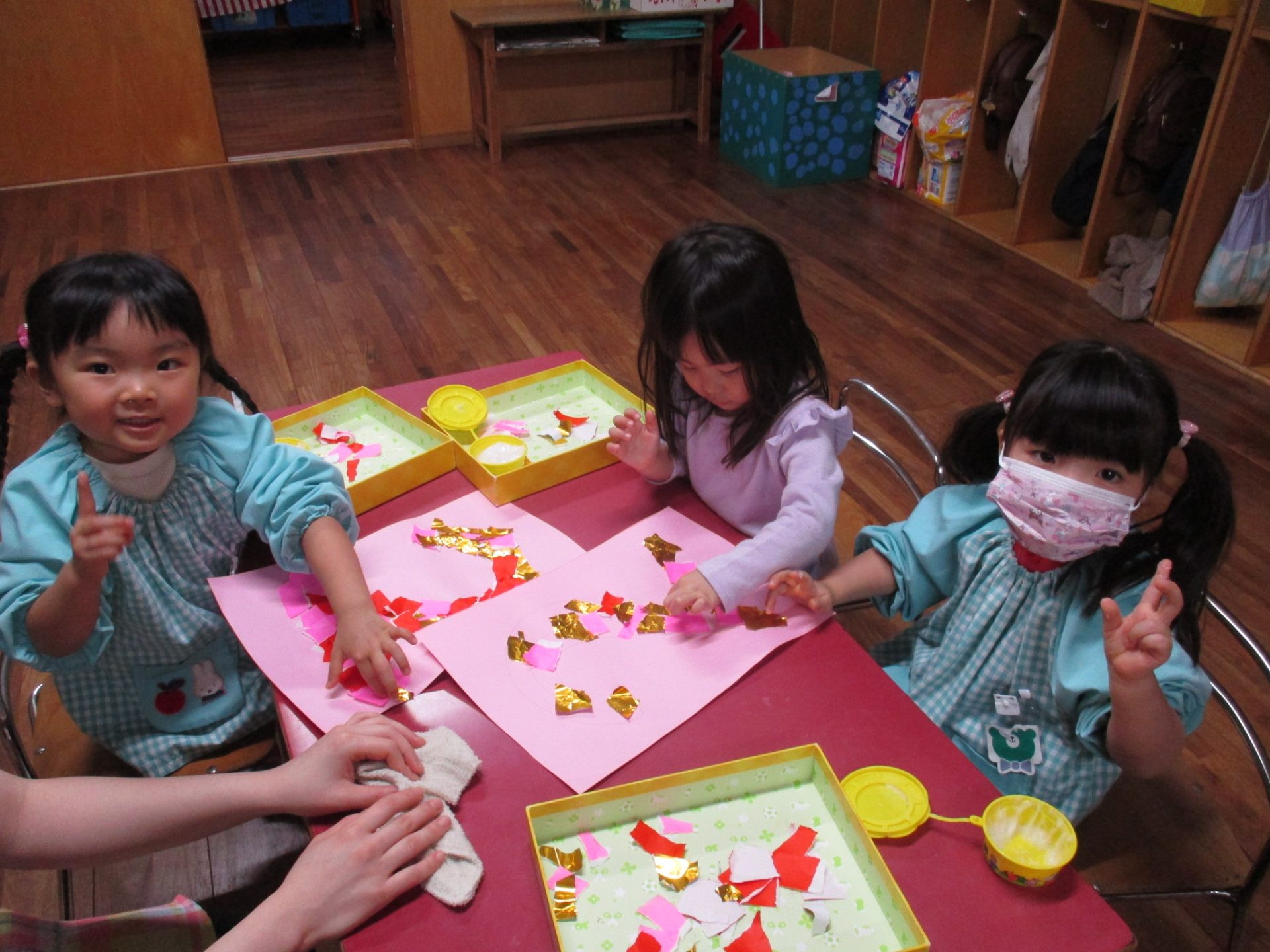 折り紙をちぎるのも貼るのも、ニコニコしながら取り組んでいましたよ♩