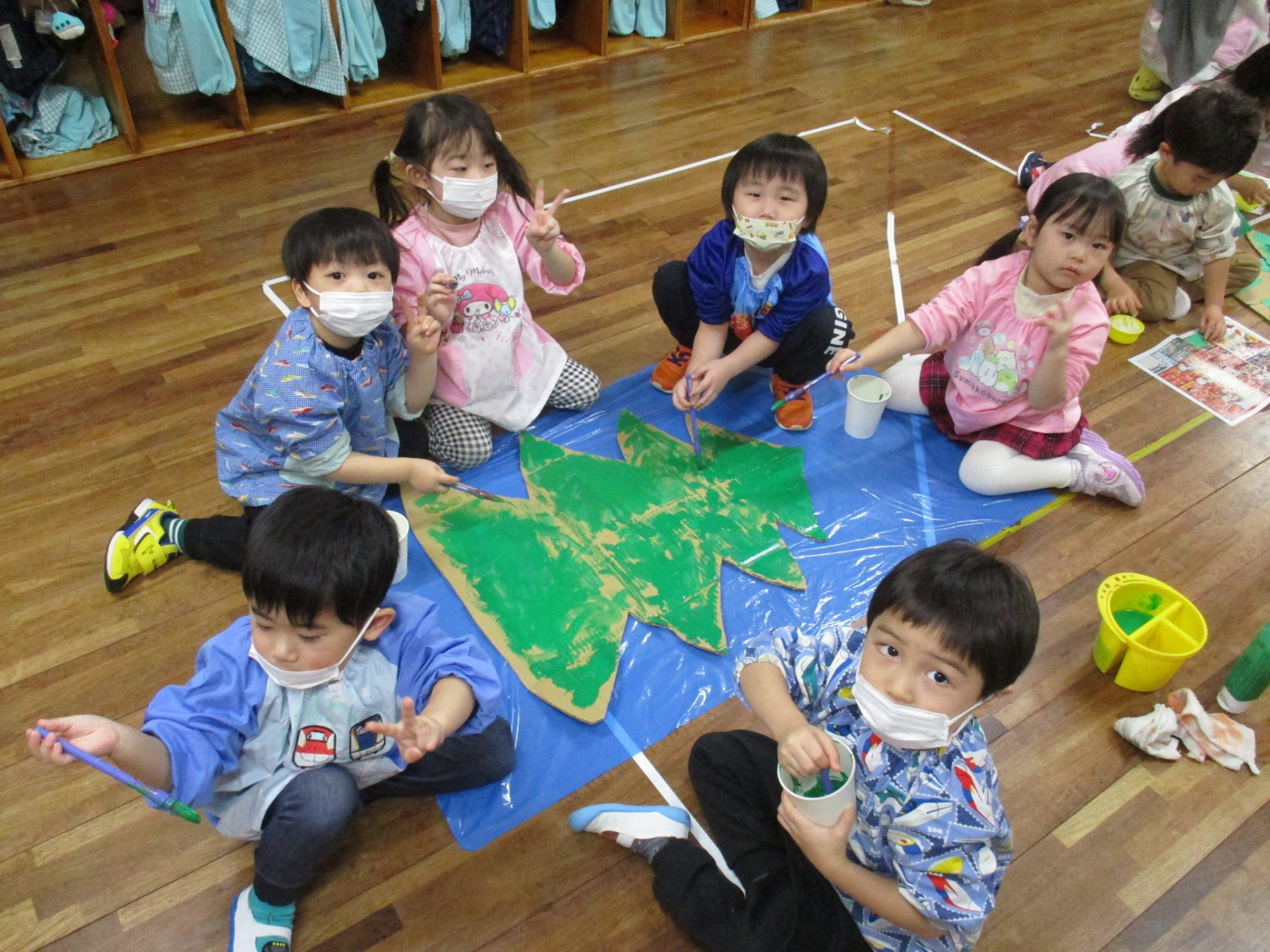 今日はツリーの形に切っておいた段ボールに、絵の具チーム・色画用紙チームに分かれて色塗りや貼り付けを行なっていきました。