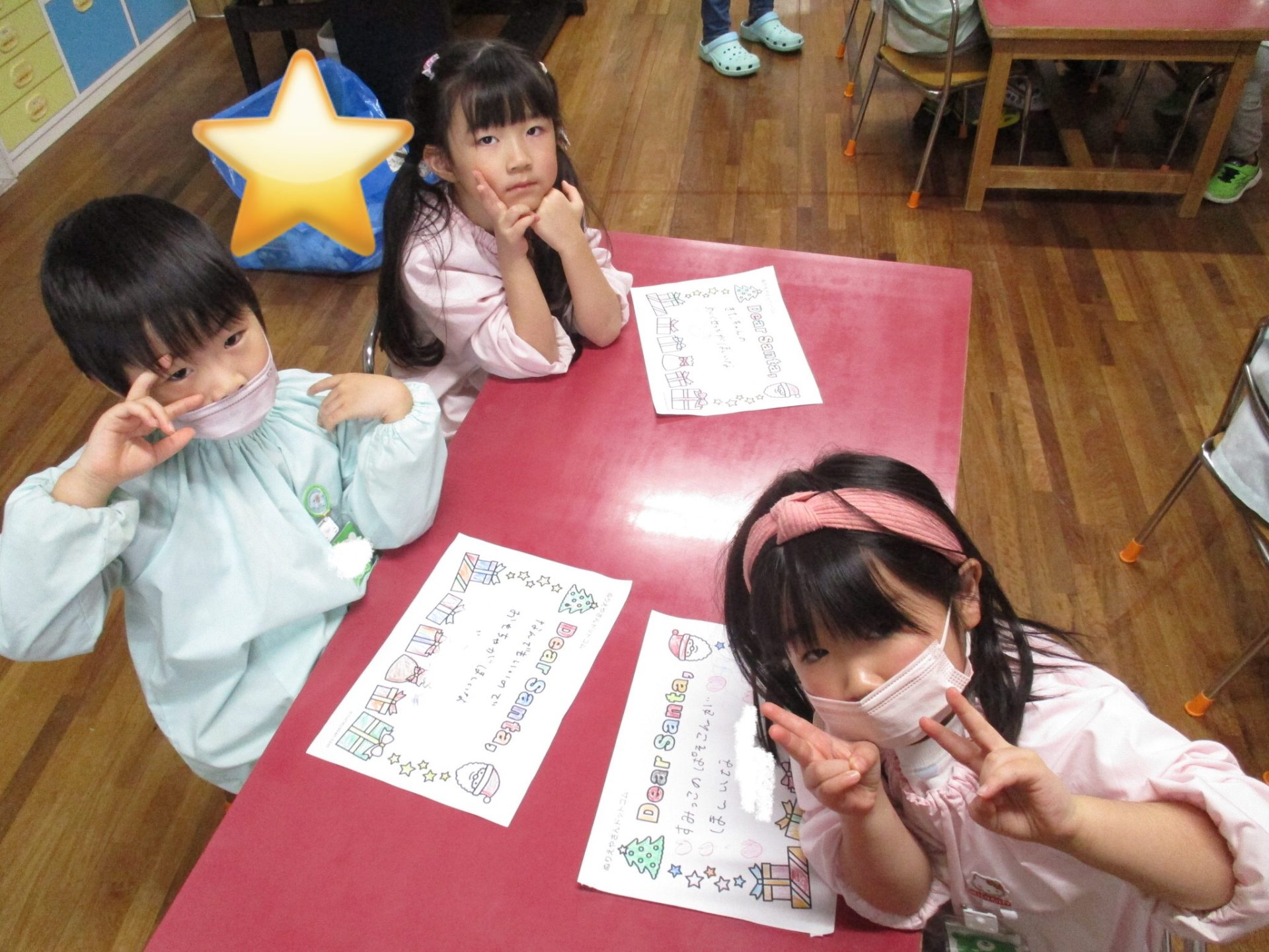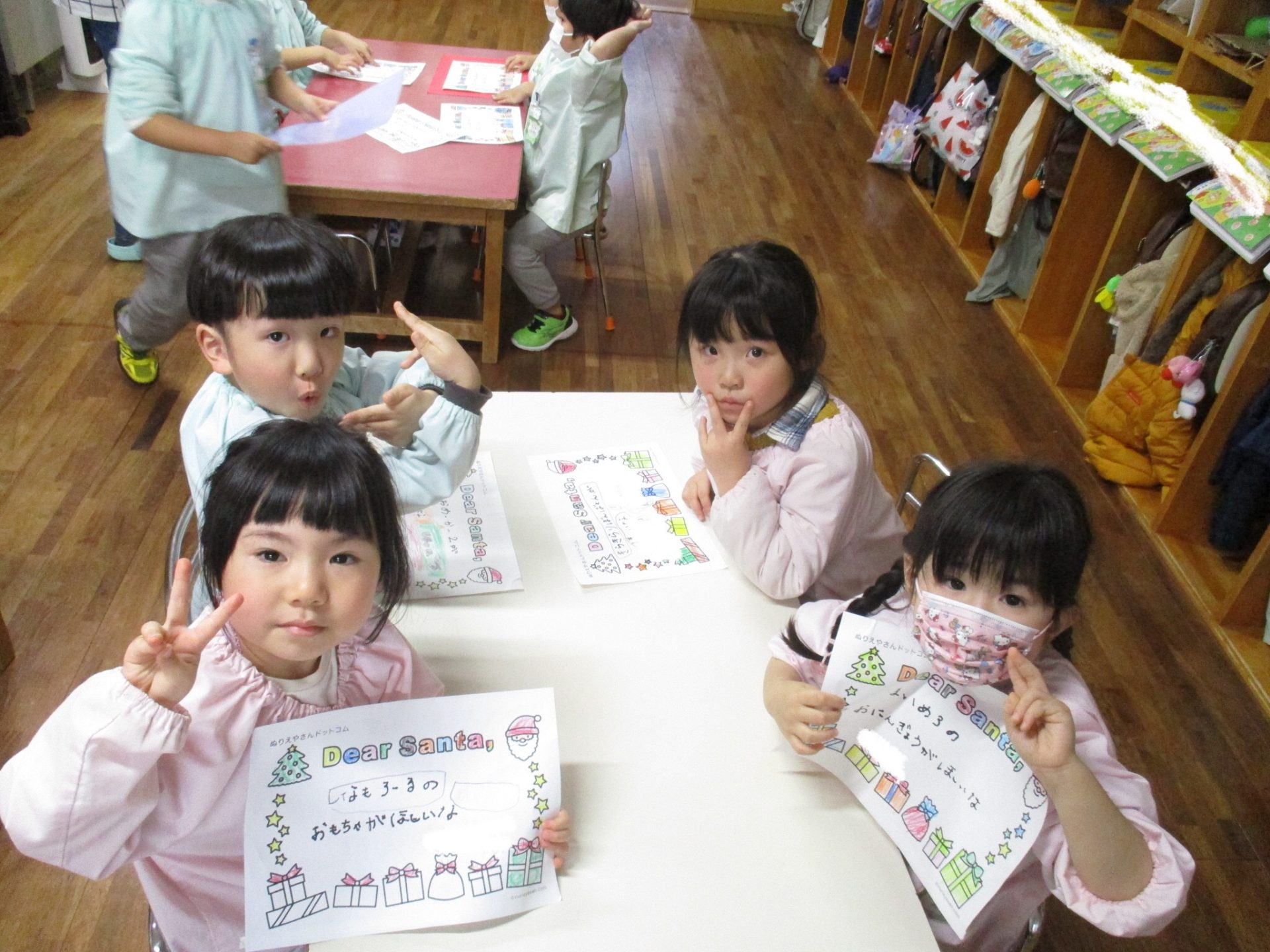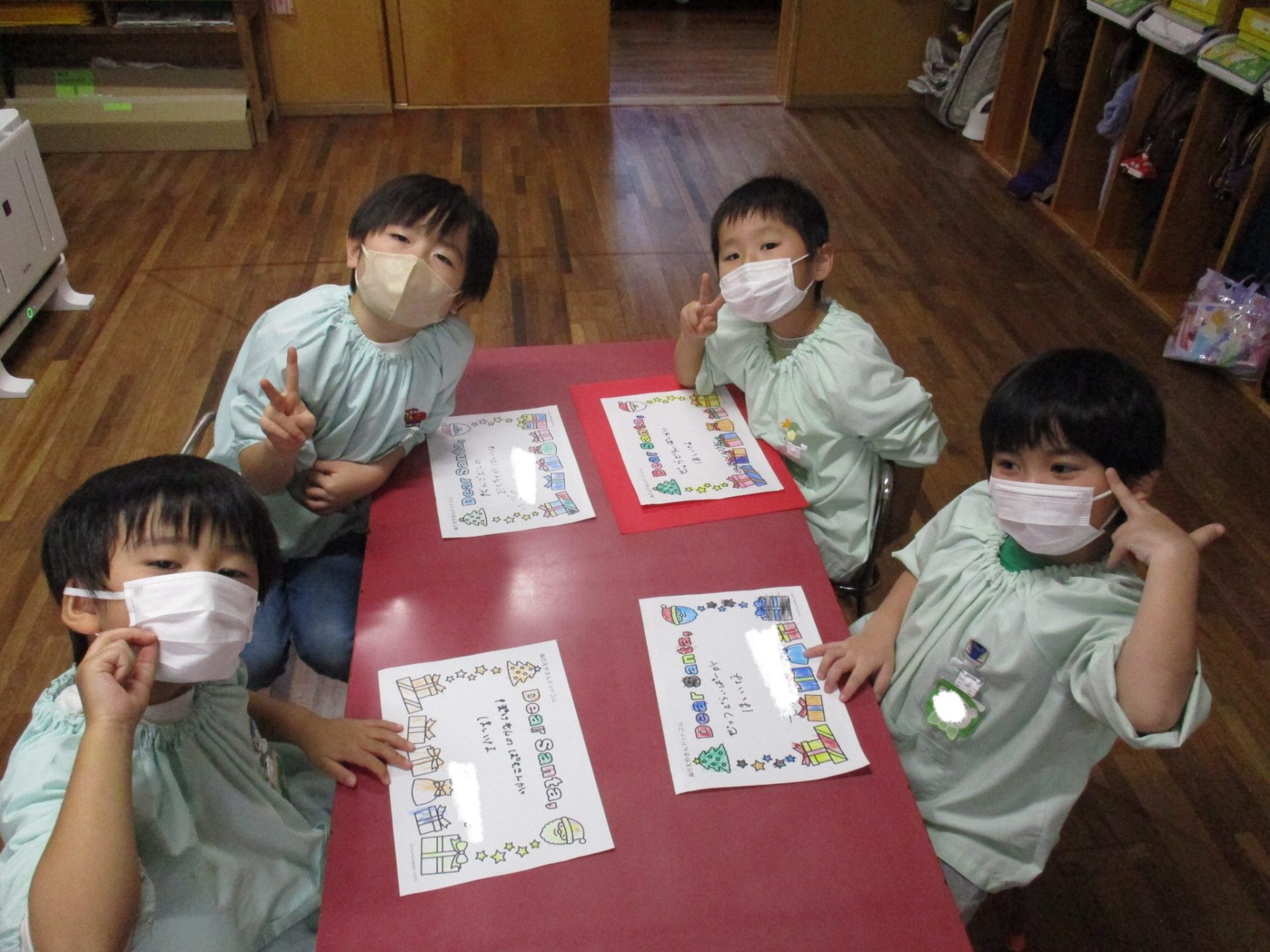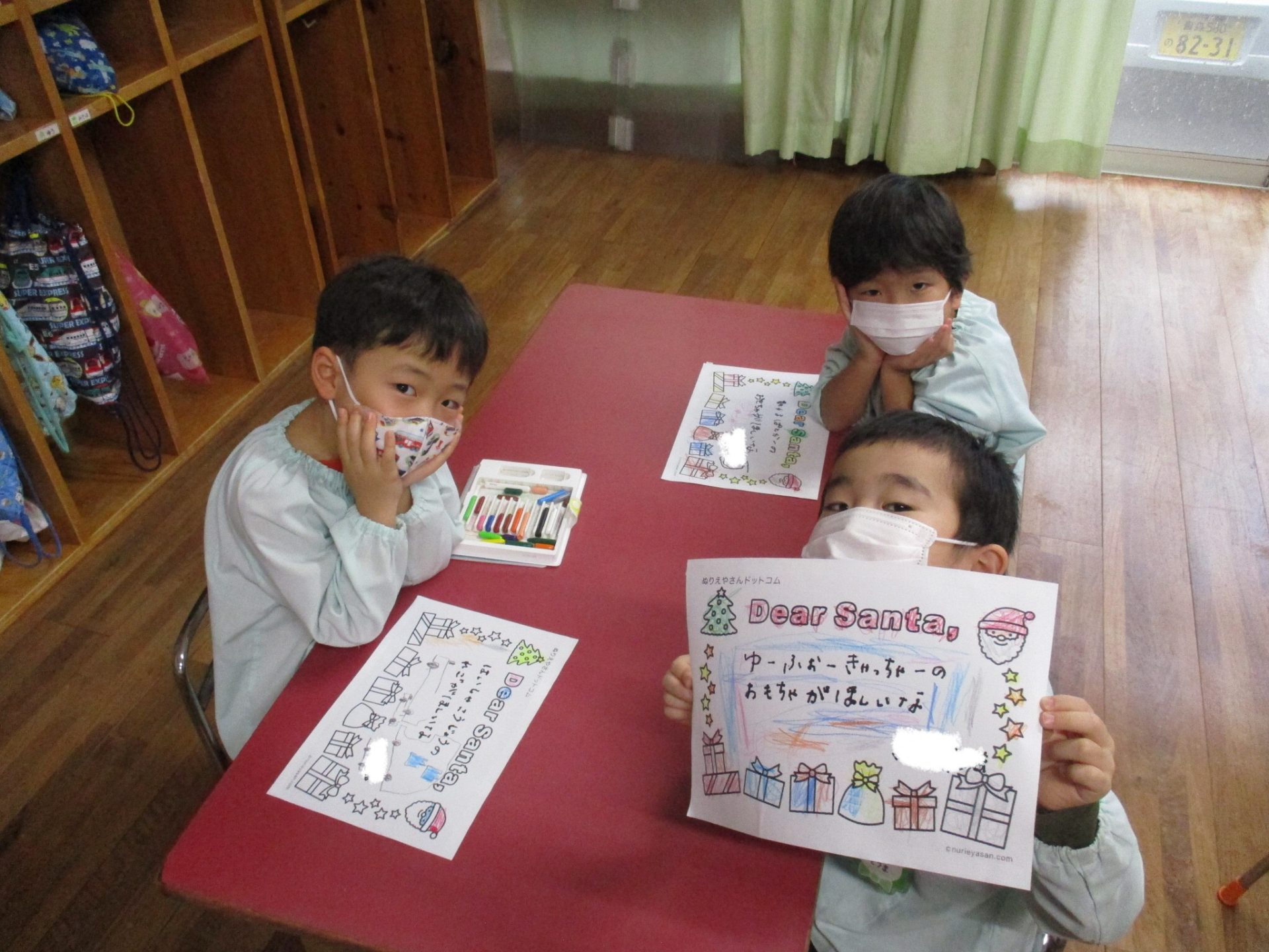クリスマスのイラストが描かれた紙に、自分の欲しいプレゼントを文字で書いていったのですが、自分の名前を書く事にも挑戦して頑張っていましたよ!