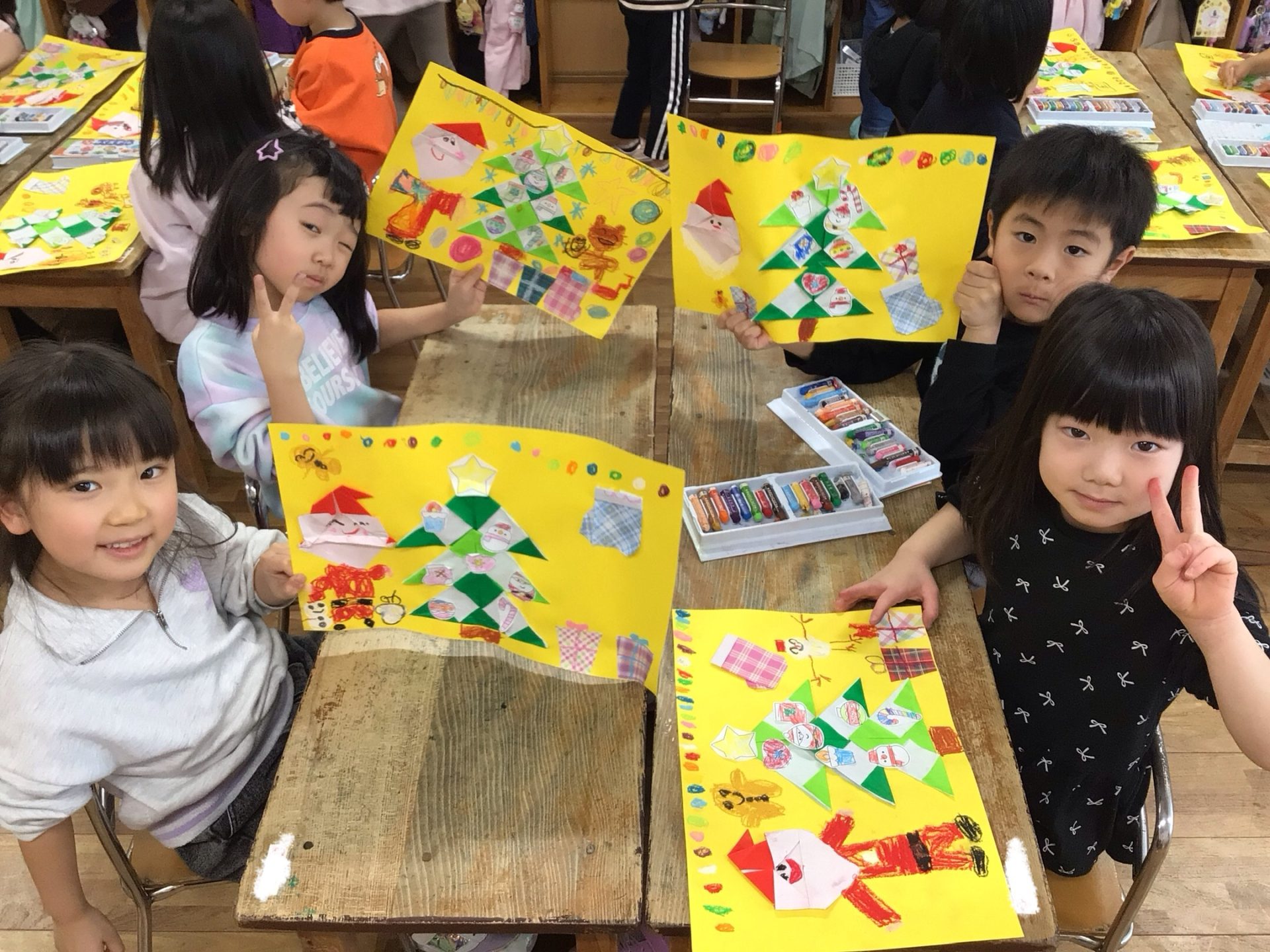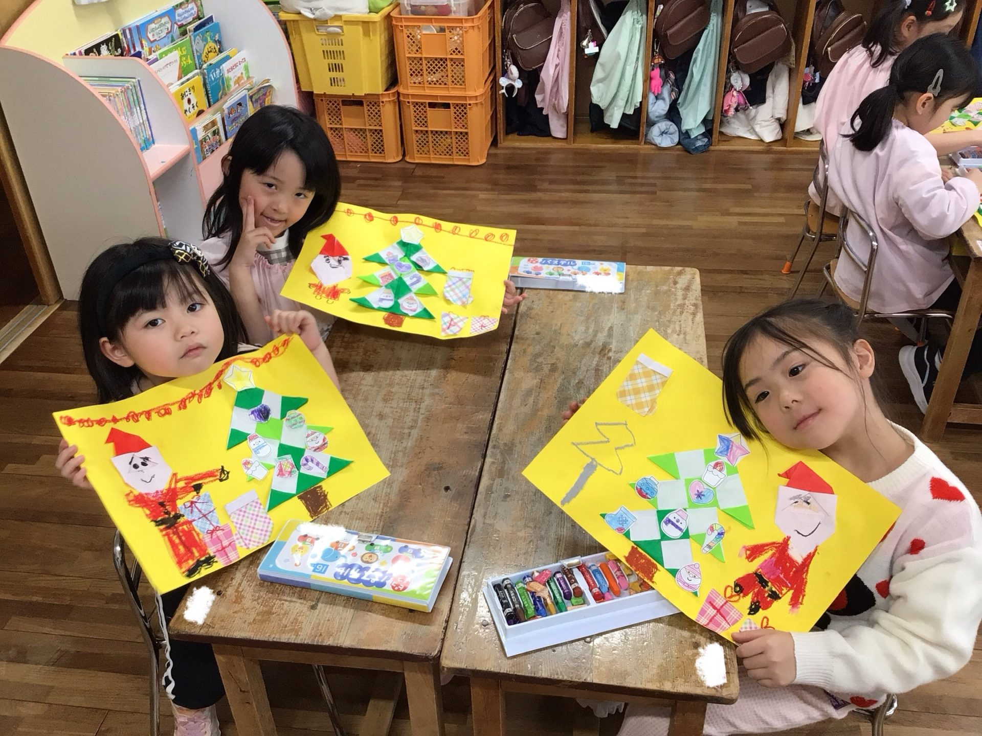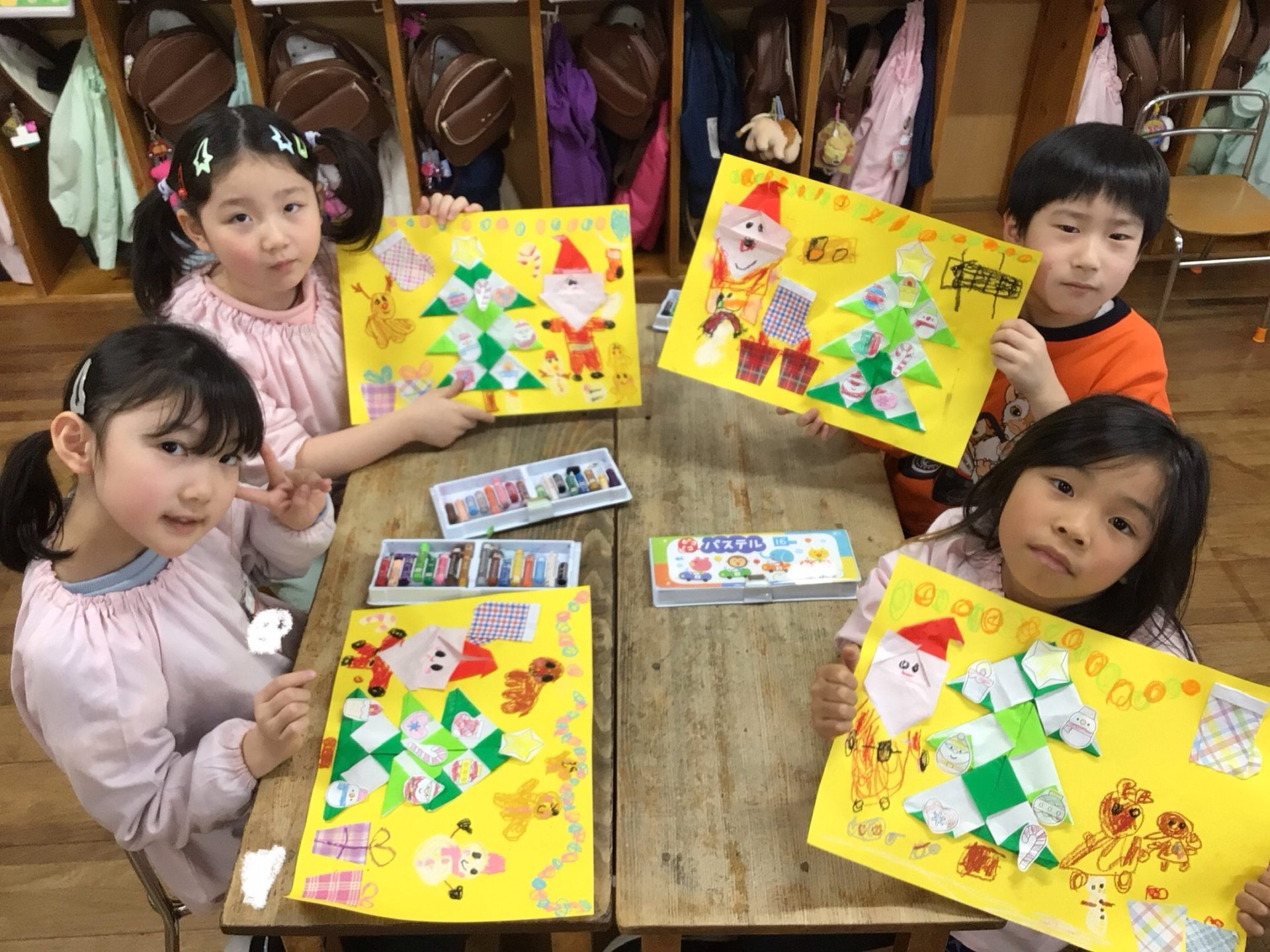 クリスマスのイラストに塗り絵をしていった物をツリーに貼り付けたり、折り紙の周りにクレヨンで描画をして完成する事が出来ました!