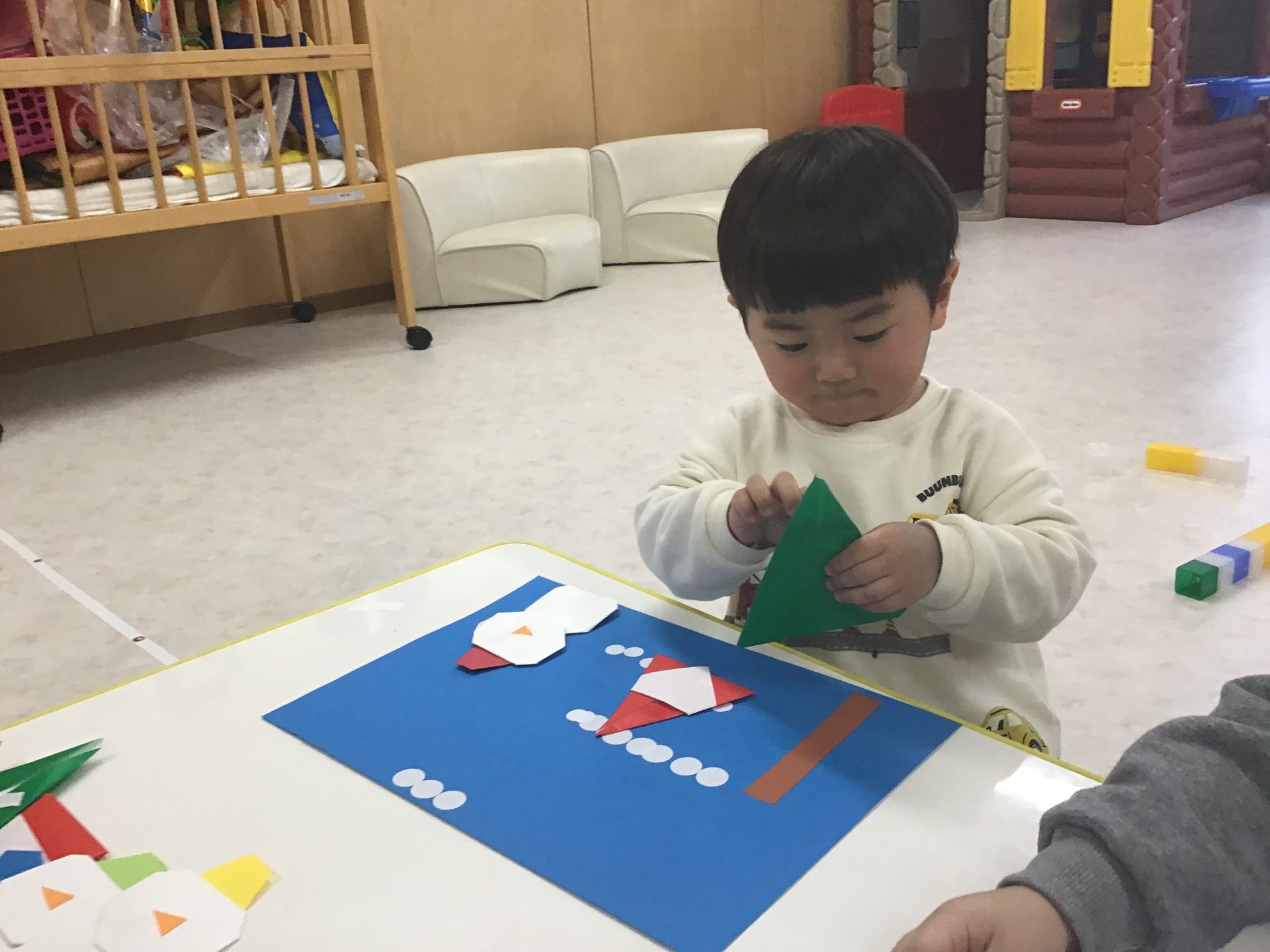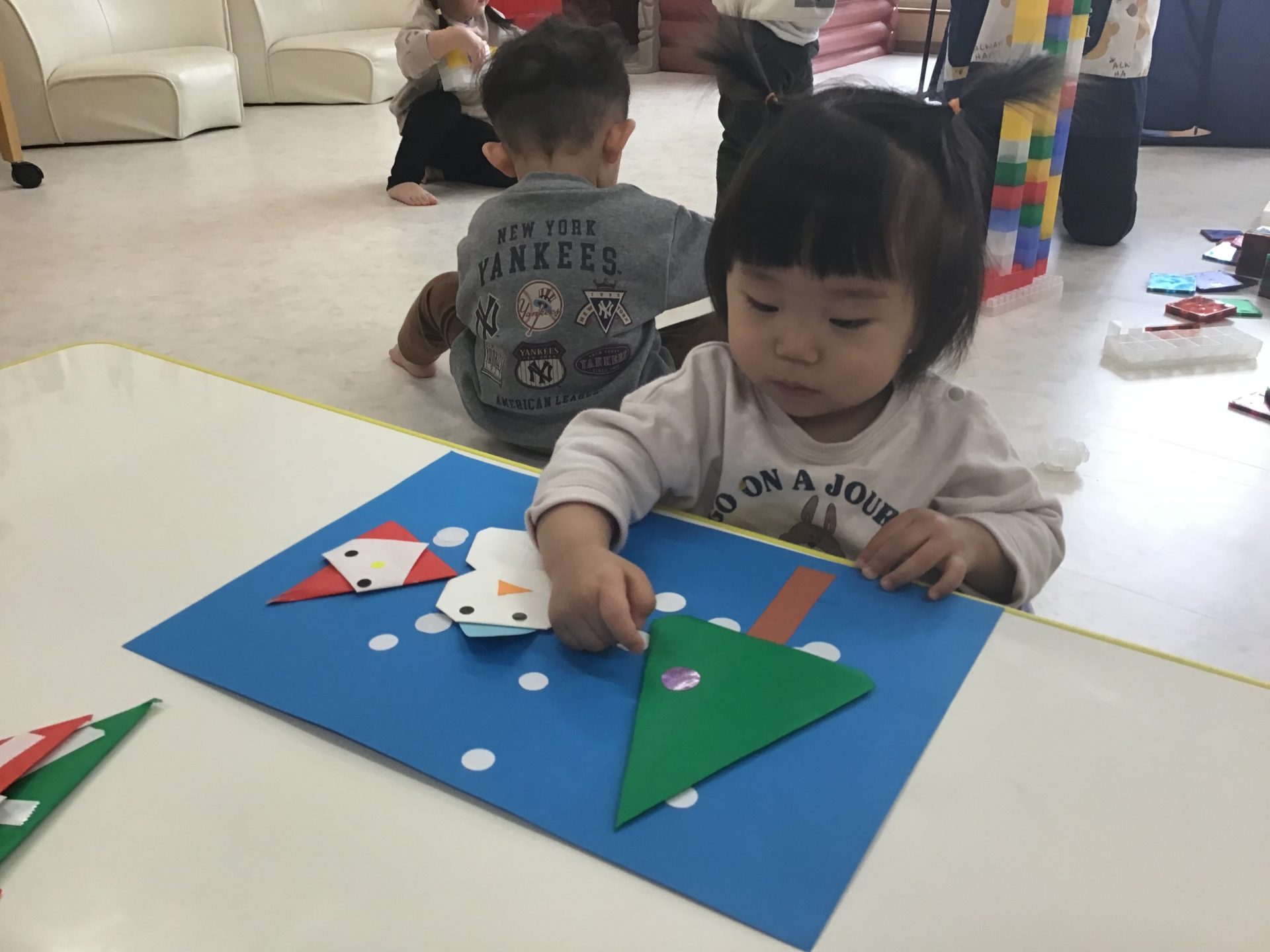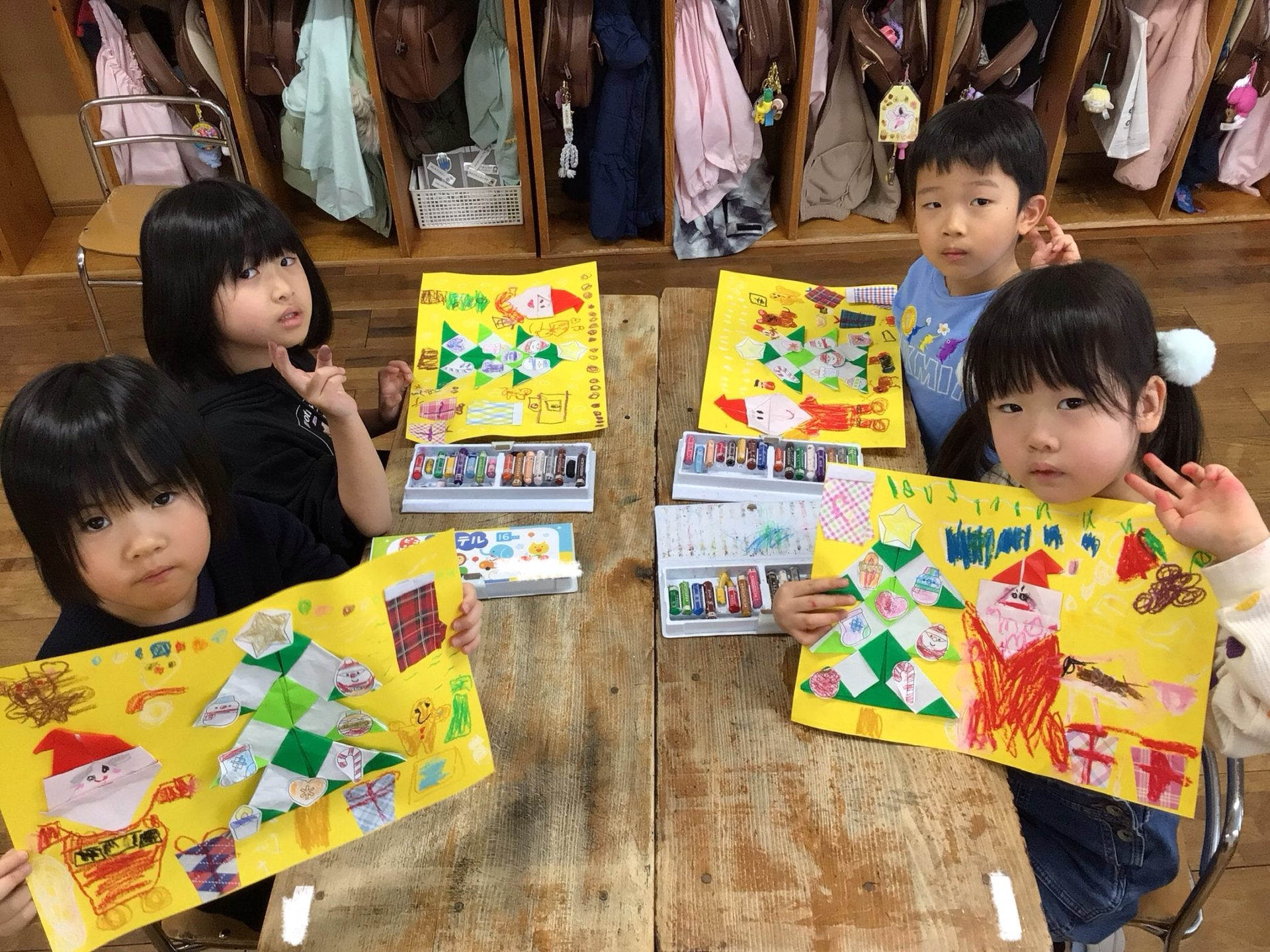 クリスマスのイラストに塗り絵をしていった物をツリーに貼り付けたり、折り紙の周りにクレヨンで描画をして完成する事が出来ました!