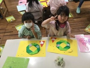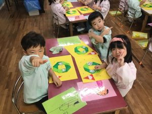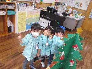 カラフルポンポンも一緒に飾ったり、キラキラモールで飾っていったので、本物のツリーの様になって、子どもたちも出来栄えに満足気な表情を見せていましたよ♩