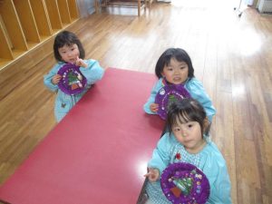 今日は昨日絵の具で色塗りをした紙皿に穴を開けておき、そこに毛糸を通してクリスマスツリーを作っていきました。