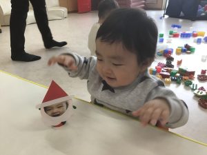先生が用意しておいた子どもたちの写真サンタを見て「これサンタさん?」と嬉しそうにしていましたよ♩