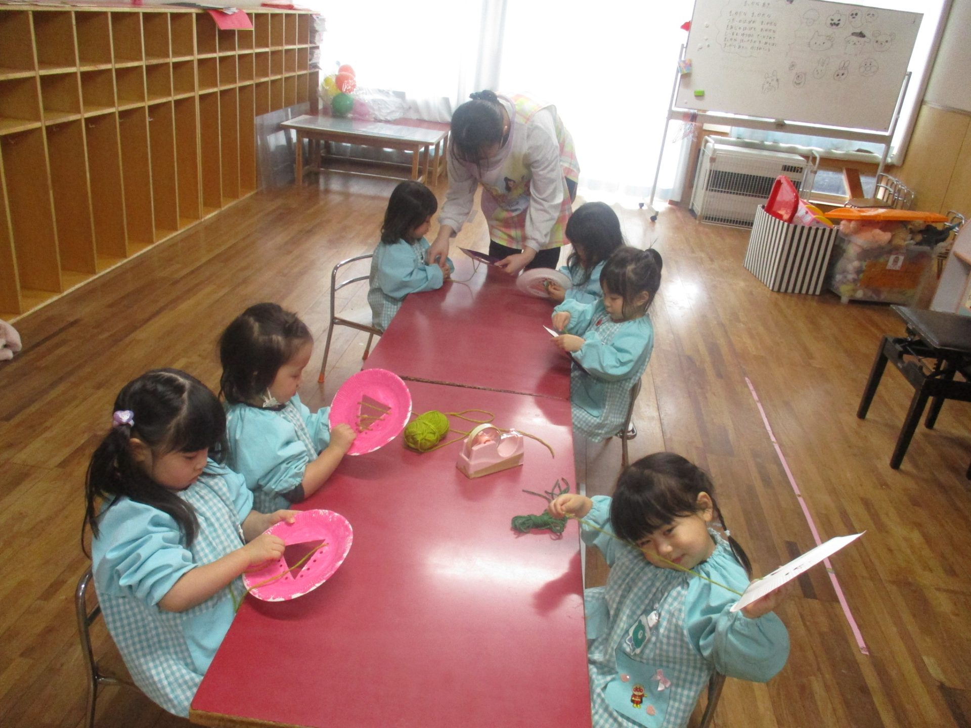 今日は昨日絵の具で色塗りをした紙皿に穴を開けておき、そこに毛糸を通してクリスマスツリーを作っていきました。