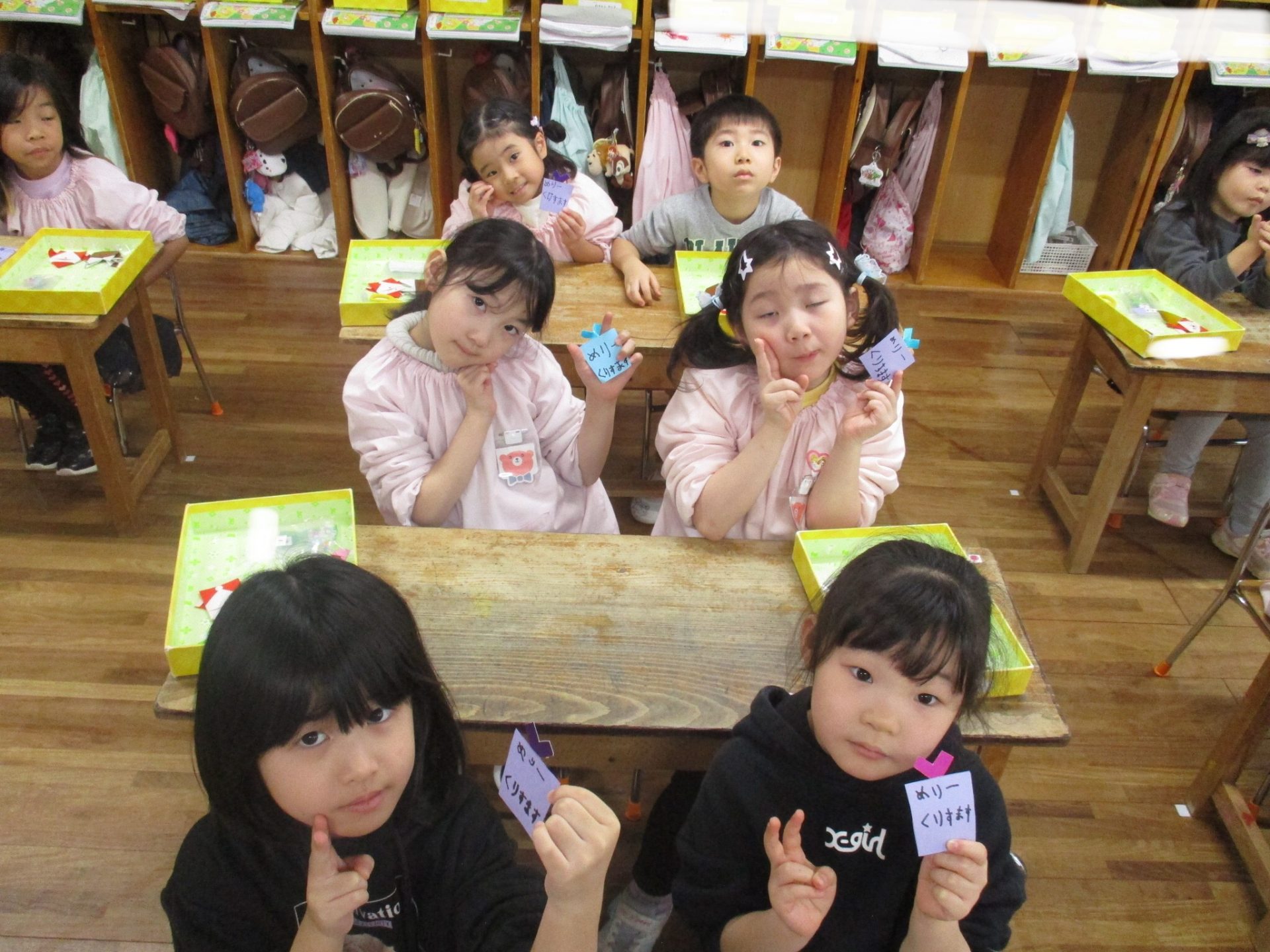 四角い形の色画用紙を配布し、それに『メリークリスマス』の文字を書いていきましたが、みんなとても上手に書くことが出来ていましたよ♩
