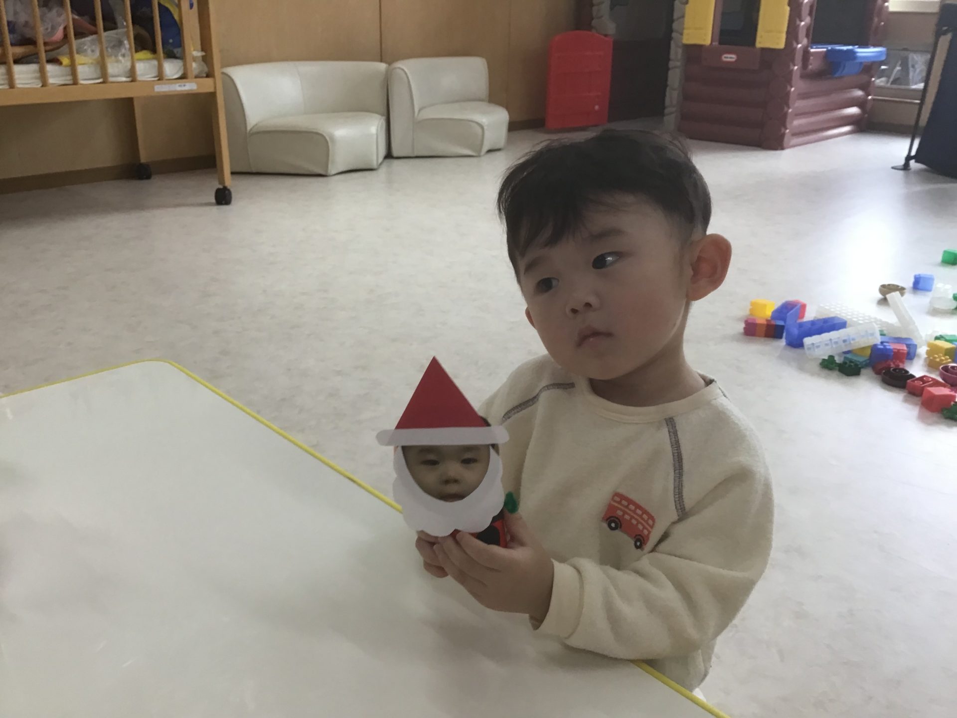 先生が用意しておいた子どもたちの写真サンタを見て「これサンタさん?」と嬉しそうにしていましたよ♩