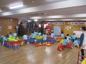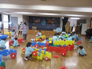 遊び始めると大きな玩具でお家を組み立てたり、車を組み立てたりして楽しむ姿が見られていました♩