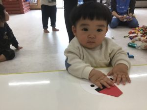 雪だるまの顔のパーツを渡されると、指で摘んで顔型の土台に貼っていきました。