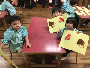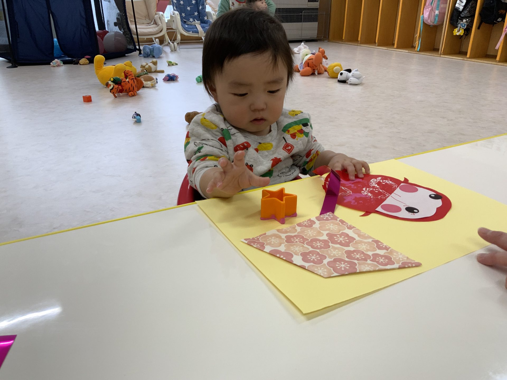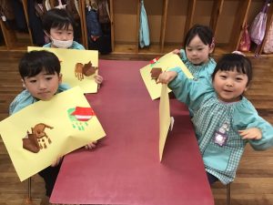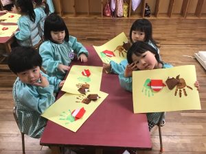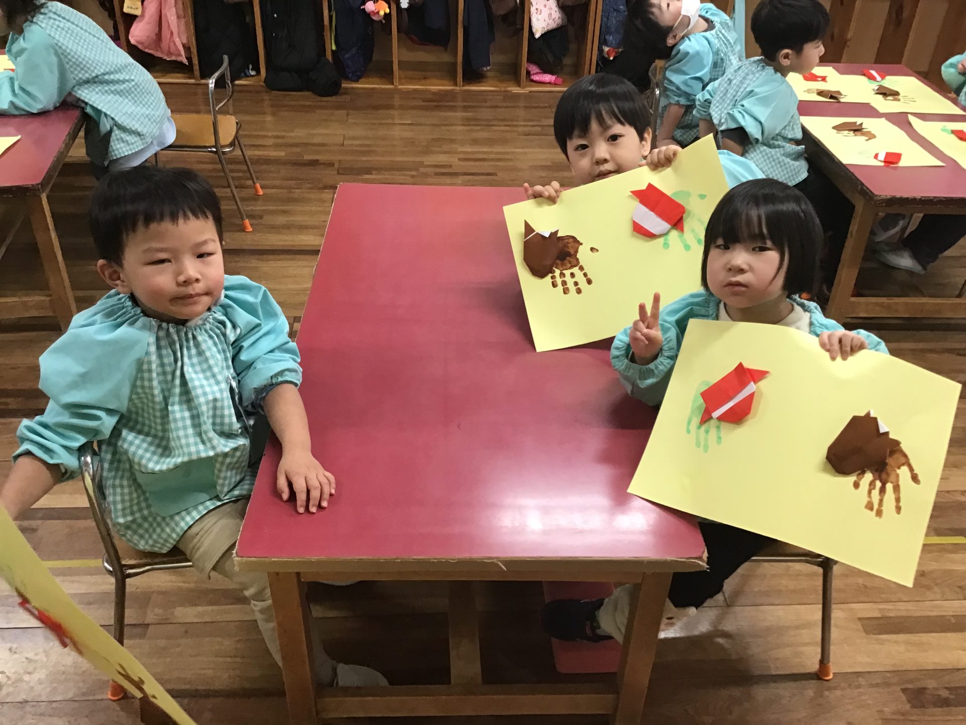 今日は昨日手形をつけていった色画用紙に、折り紙で作った馬・獅子舞を貼り付けていきました。