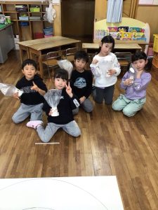 今日は紙コップとポリ袋を使ってパラシュート作を行なっていました。