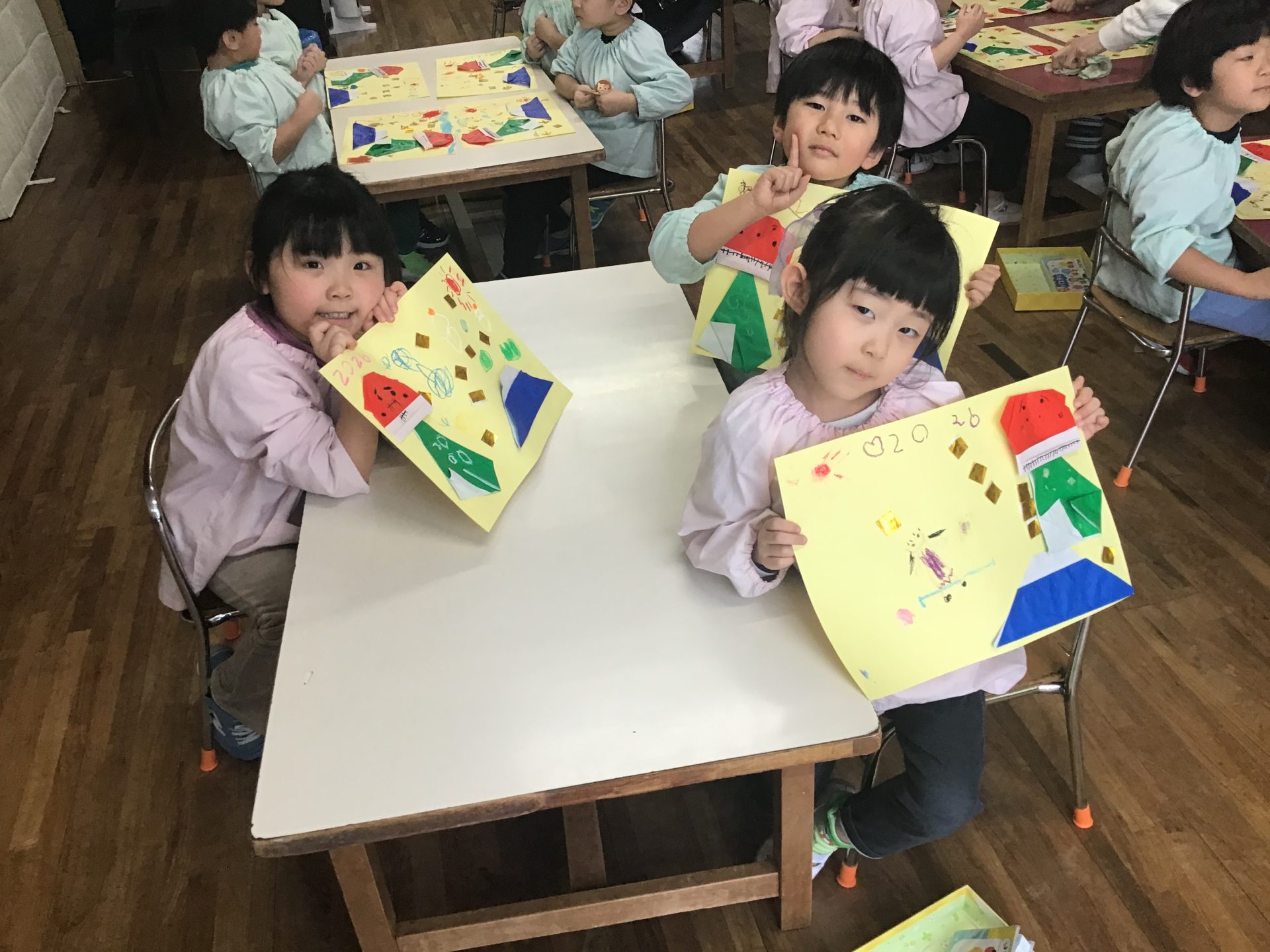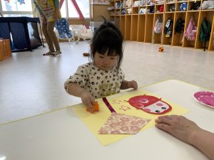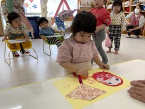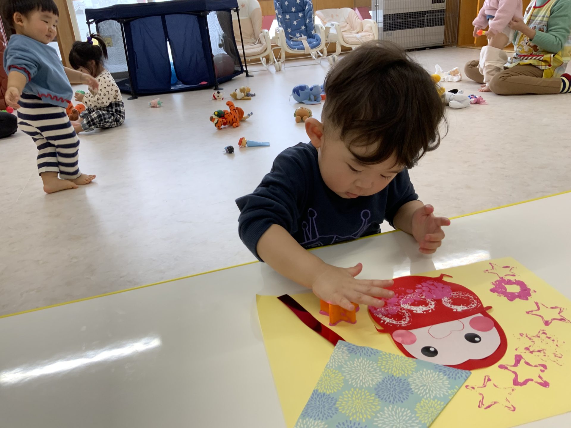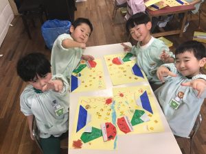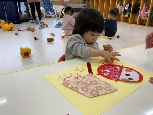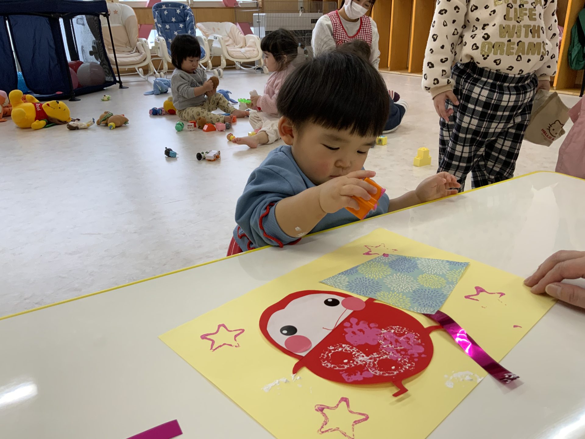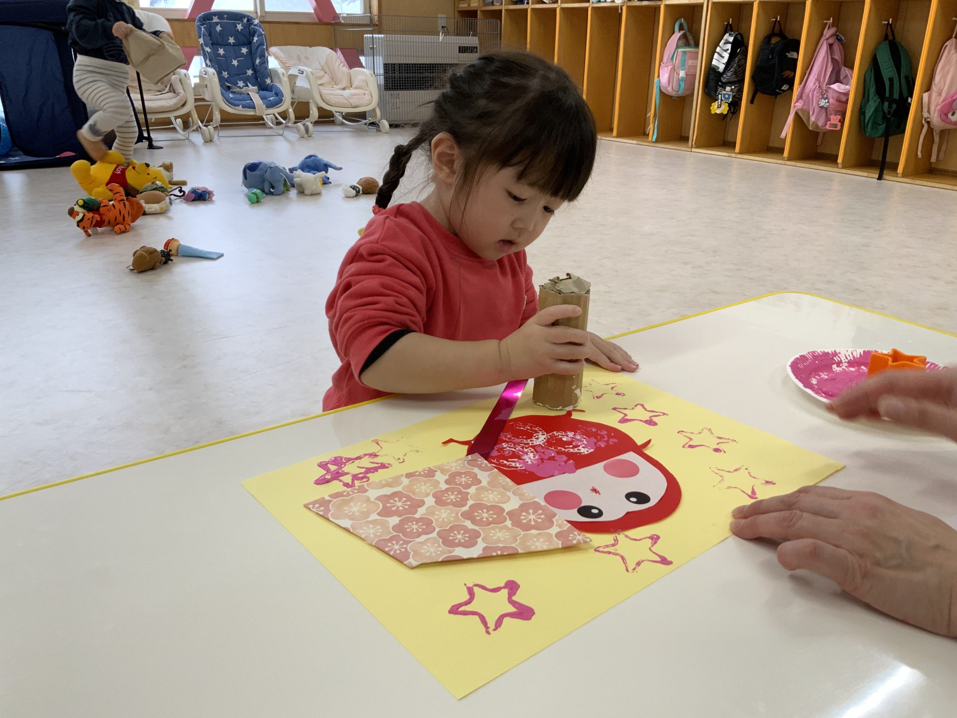 今日は前もって折り紙で作っておいた凧・ダルマを色画用紙に貼り付けて、その周りに絵の具でスタンピングを行なっていきました。