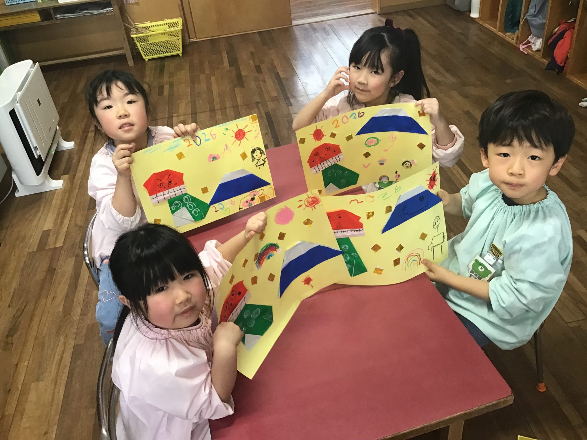今日は昨日折り紙で作った富士山や獅子舞の折り紙を、色画用紙に貼りつけて、周りにクレヨンで描画を行なっていきました。