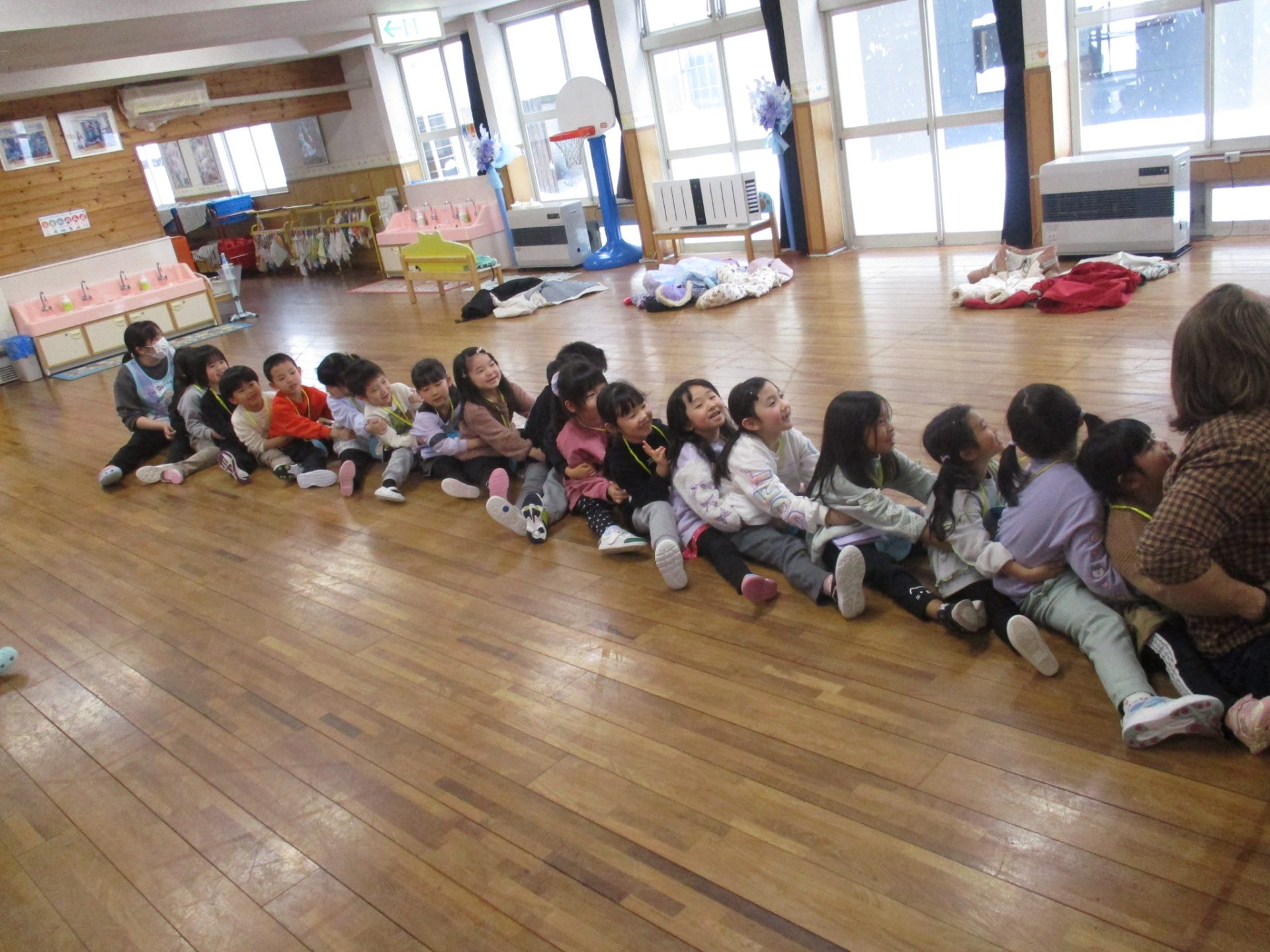 途中で幼稚園の玄関に暖をとりにいくと「幼稚園、暖かい〜♩」とニコニコ。