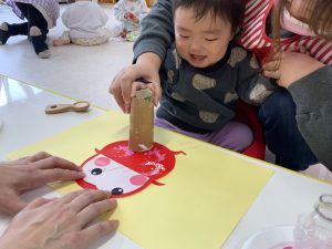 次にダンボールをグルグルと丸めたものに、白い絵の具を見つけて、それをだるまさんのお腹の所にスタンピングをしました!!そしてつぶつぶした素材のものを、ピンク色でスタンピングをしました🎵