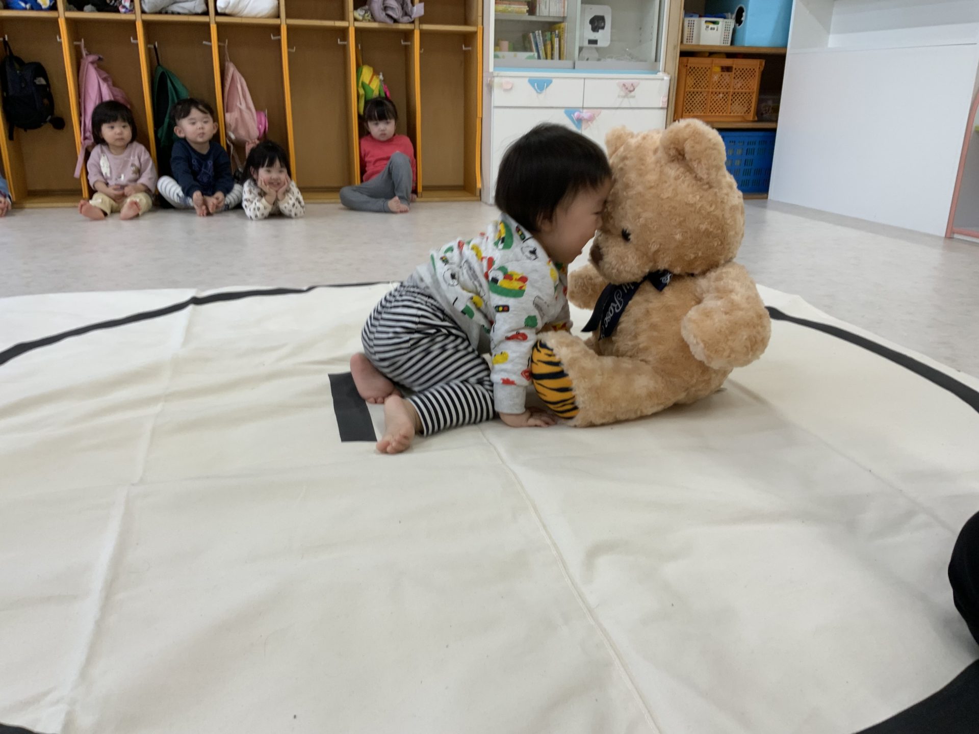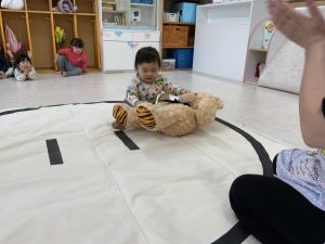 なんとかマットを敷き終えて練習をしてみると、押し合うということがまだ難しいのか、ぎゅーっと抱き合ってそのまま歩いてみたり、相手に触れる事なくマットの上から出たりと、おすもうとは程遠いような💦